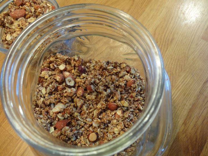 Låt gärna plåtarna stå kvar i ugnen på eftervärmen eftersom det gör granolan mer knaprig. Låt sedan svalna en stund i rumsvärme innan du lägger upp den i burkar.