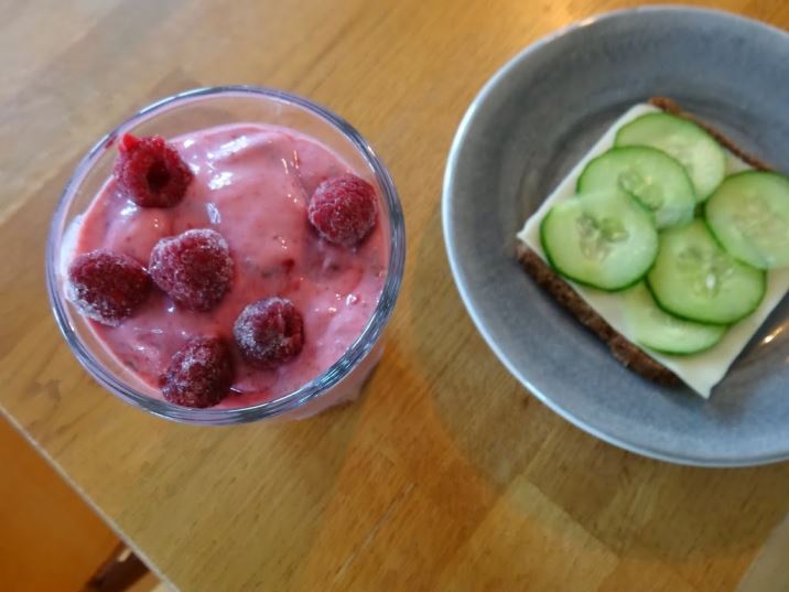 God morgon! Här startas dagen med en god hallonsmoothie och smörgås till det. Inte bara smaken av hallon gör mig glad, utan även färgen. Detta hade jag i morgonens smoothie: frysta hallon, kvarg, macapulver, linfrön och mjölk. De frysta hallonen gjorde den härligt glassig i konsistensen.