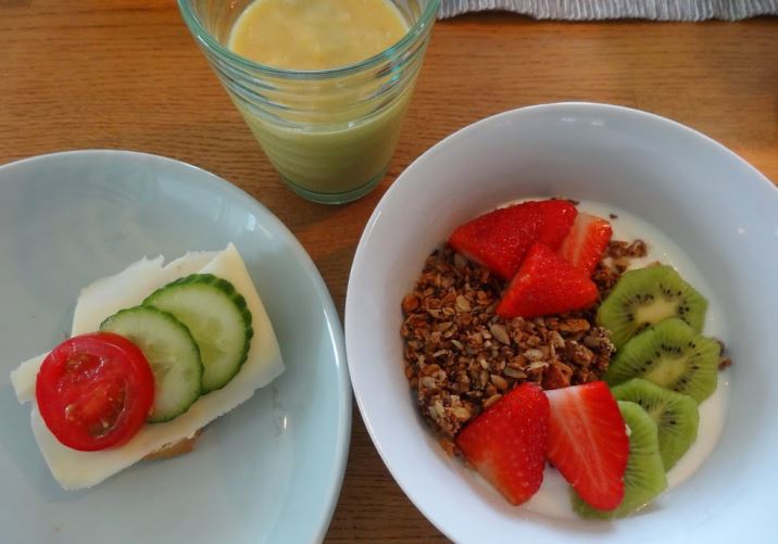 På morgonens frukostbord fanns: bröd, olika pålägg, grönsaker, frukt och bär, min granola och andra flingor, yoghurt, juice och kaffe. Jag tog för mig av ett gott valnötsbröd med ost, gurka och tomat. Till det en skål med naturell yoghurt, granolan (som blev väldigt god!) samt jordgubbar och kiwi. Och så drack jag av den fräscha mangosmoothie som jag hade mixat ihop på morgonen. En frukost som fick högsta möjliga betyg!