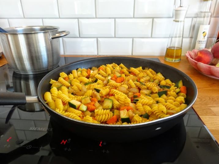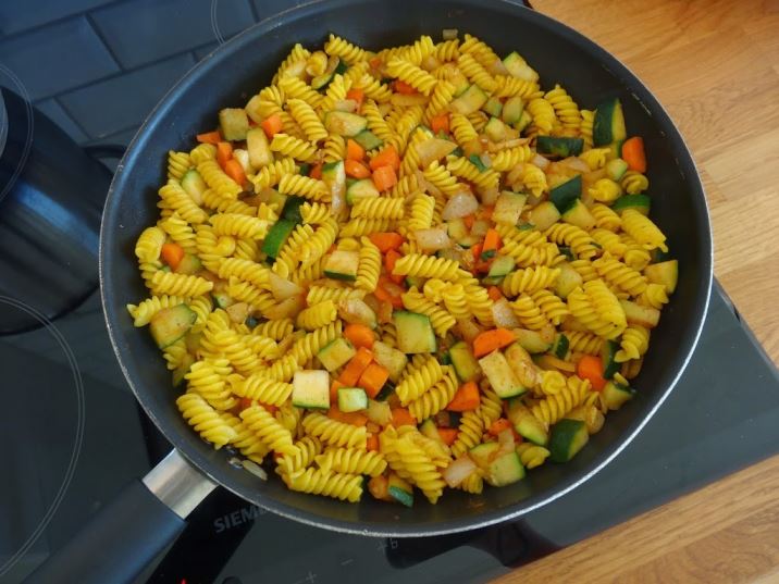 Koka pastan i vatten, kryddat med gurkmeja. Skala lök och morötter. Skär alla grönsaker i mindre bitar. Hetta upp en stekpanna med olja och lägg i grönsakerna. Krydda med chili och peppar. Låt fräsa under medelstark värme tills de har mjuknat. När pastan är klar häller du av pastavattnet och tillsätter pastan i stekpannan med grönsakerna. Stäng av värmen, blanda runt och låt allt ta smak av varandra.