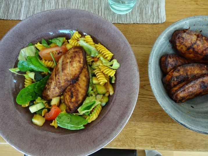 Inspirationen hämtade jag från ett recept som Jacob Wismar har tagit fram åt Quorn. Han har bland annat skapat receptet Asiatisk quorn BBQ med glasnudelsallad. Jag följde hans instruktioner när det kom till quornfiléerna, men improviserade fram en varm pastasallad istället för glasnudelsallad. Ni som tycker att quorn är smaklöst ska testa detta recept då det är allt annat än just det. Ingefära, chili och vitlök sätter härlig asiatisk prägel och smak på filéerna.