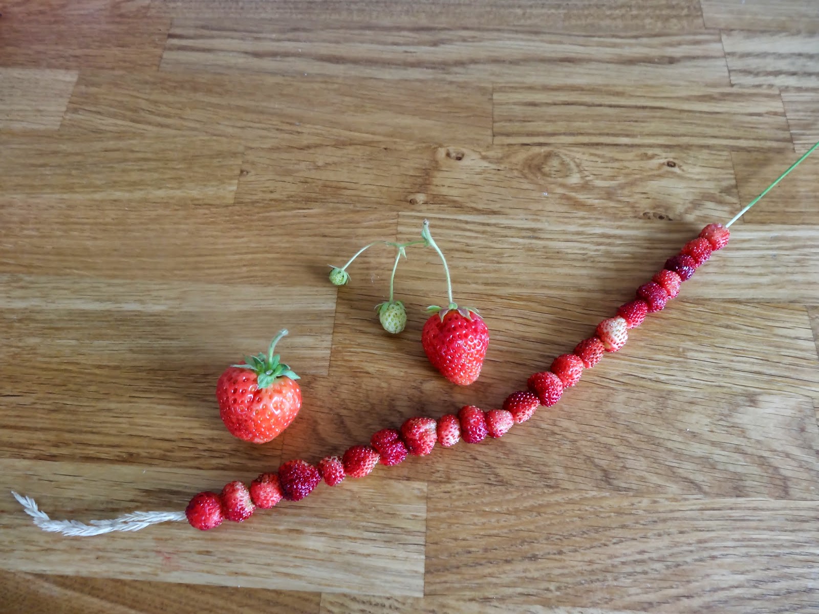 Även fast vädret inte är det roligaste går det att få sommarkänslor ändå. Som idag när jag plockade smultron och jordgubbar från trädgårdslandet och trädde de förstnämnda på strå. Då är det sommar!
