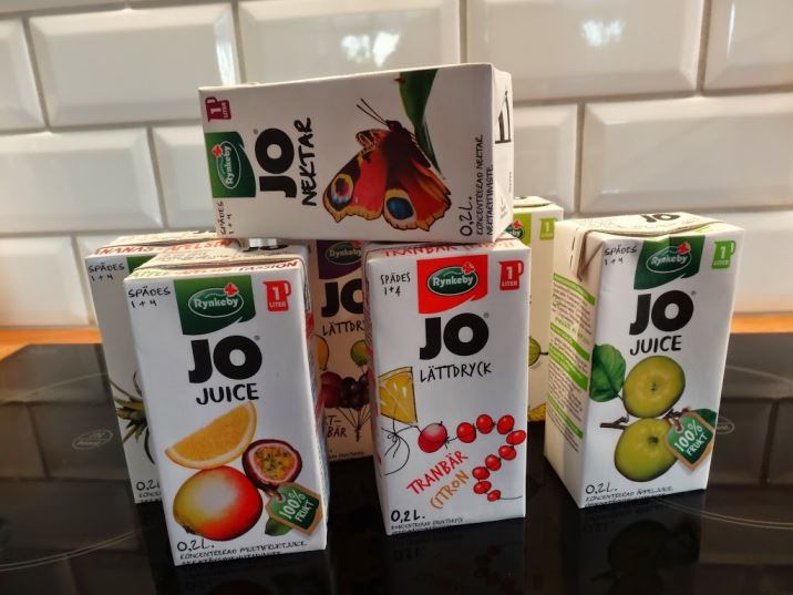 Vi hade med oss juicen av apelsin idag, men JO finns i flera olika smaker och i juice såväl som nektar och lättdryck. De två sistnämnda innehåller dock en del socker.