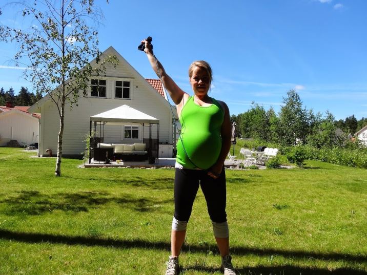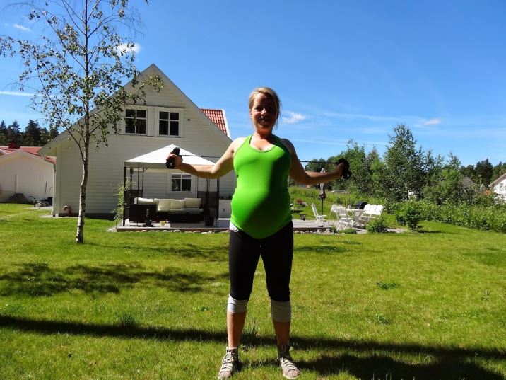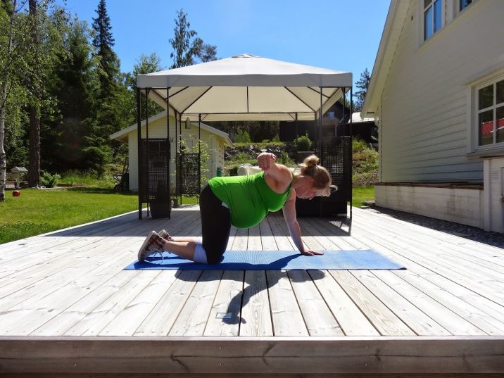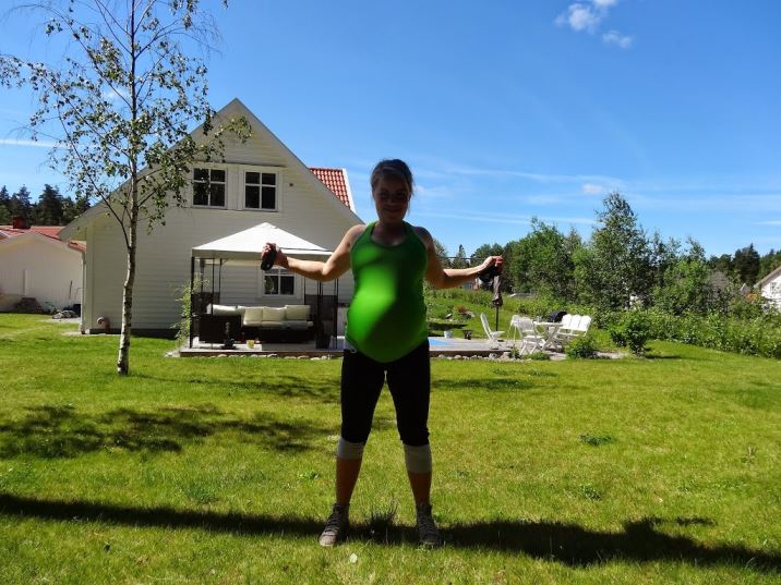 Här visar jag nu de övningar jag körde idag. Använde bara gummiband och matta som redskap och fokus låg främst på rörlighet och lätt styrka för framför allt axlar och rygg. Fördelen med gummiband är att man kan spänna åt det olika hårt beroende på hur tungt man vill träna och är man stark kan man köra de första övningarna, som jag gör på matta, med hantlar för att få ut mer av träningspasset. Övningarna här fungerar alltså inte bara för höggravida utan går att göras av alla.