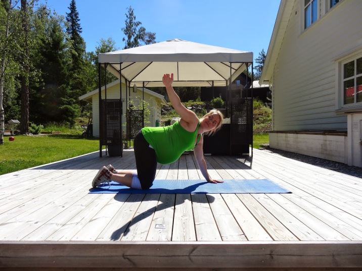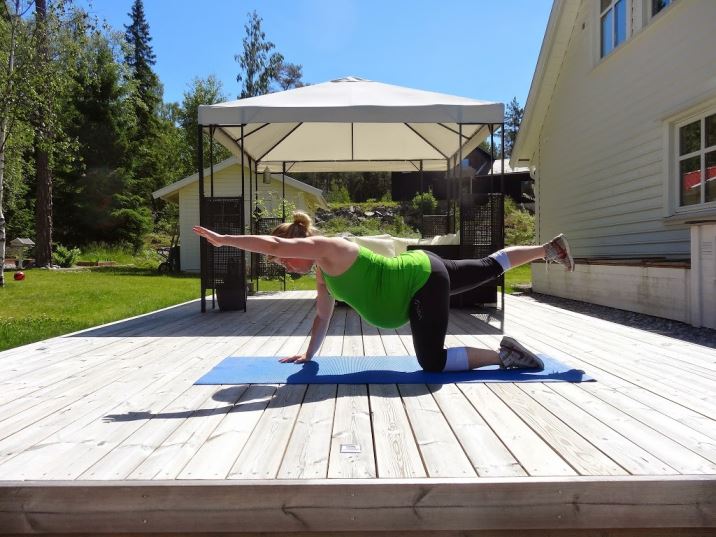 3. Hunden med ben- och armlyft: Lyft arm och motsatt ben samtidigt och sträck ut. Bålen skall vara stabil. Syftet är att träna transversus och hålla kontrollen över bål när arm och ben rör sig.