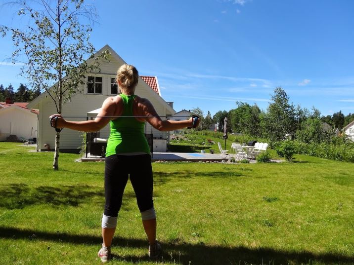 3. Axel latsdrag med gummiband: Föreställ dig att du gör ett latsdrag i kabelmaskin, men här skapar du själv motståndet. Dra ner armarna bakom huvudet samtidigt som du breddar bandet. Håll armbågarna framför kroppen och tryck fram bröstet.