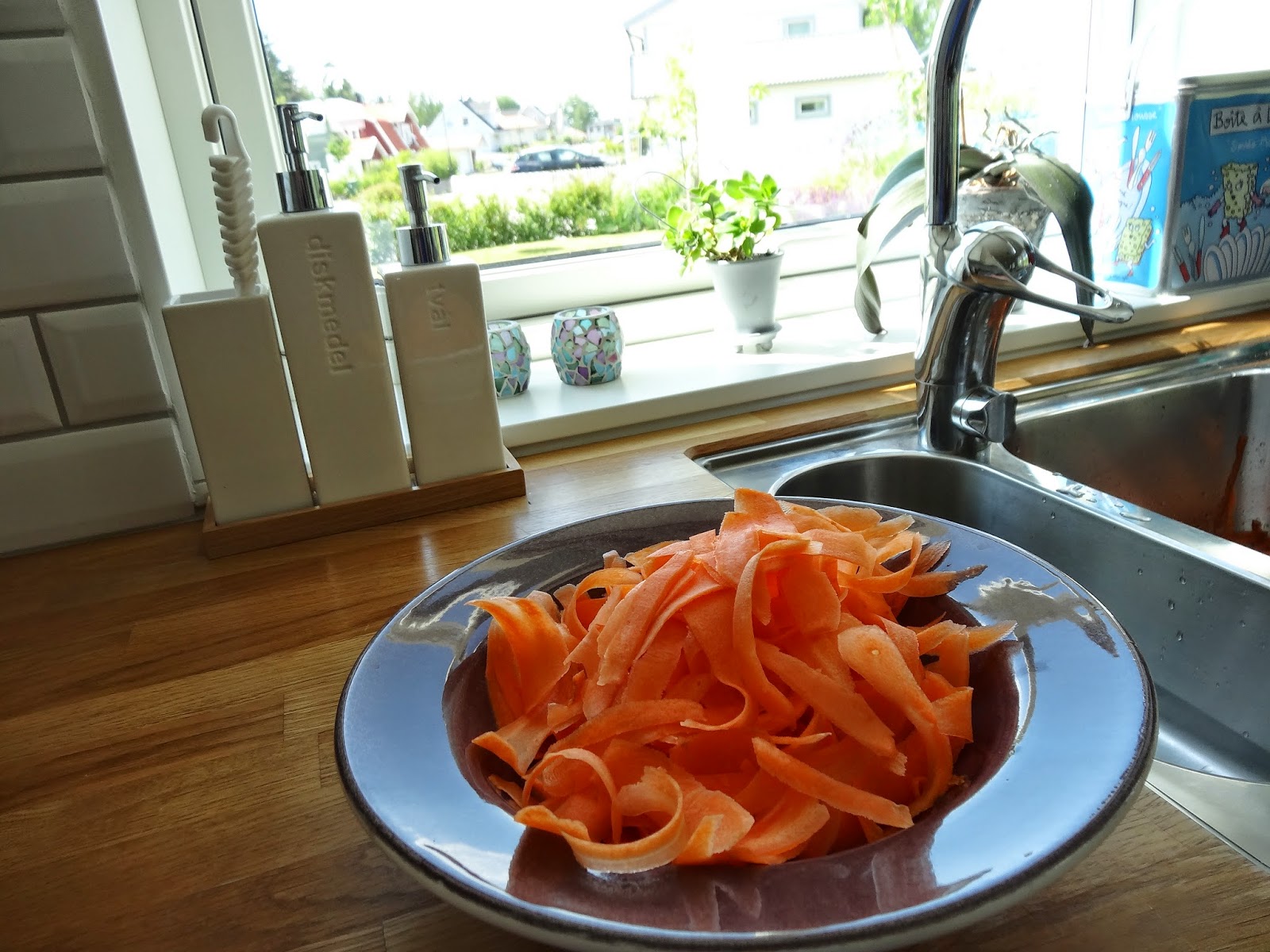 Idag stod det spagetti på lunchmenyn och jag valde då att göra strimlor av fyra morötter för att sedan låta dem koka med pastan under den sista minuten av koktiden. När man serverar spagettin tillsammans med morötterna på det sättet är det svårare för barn (och vuxna) att låta bli att äta av grönsaken. Och själv tycker jag att pastan blir mycket godare med morötter i.