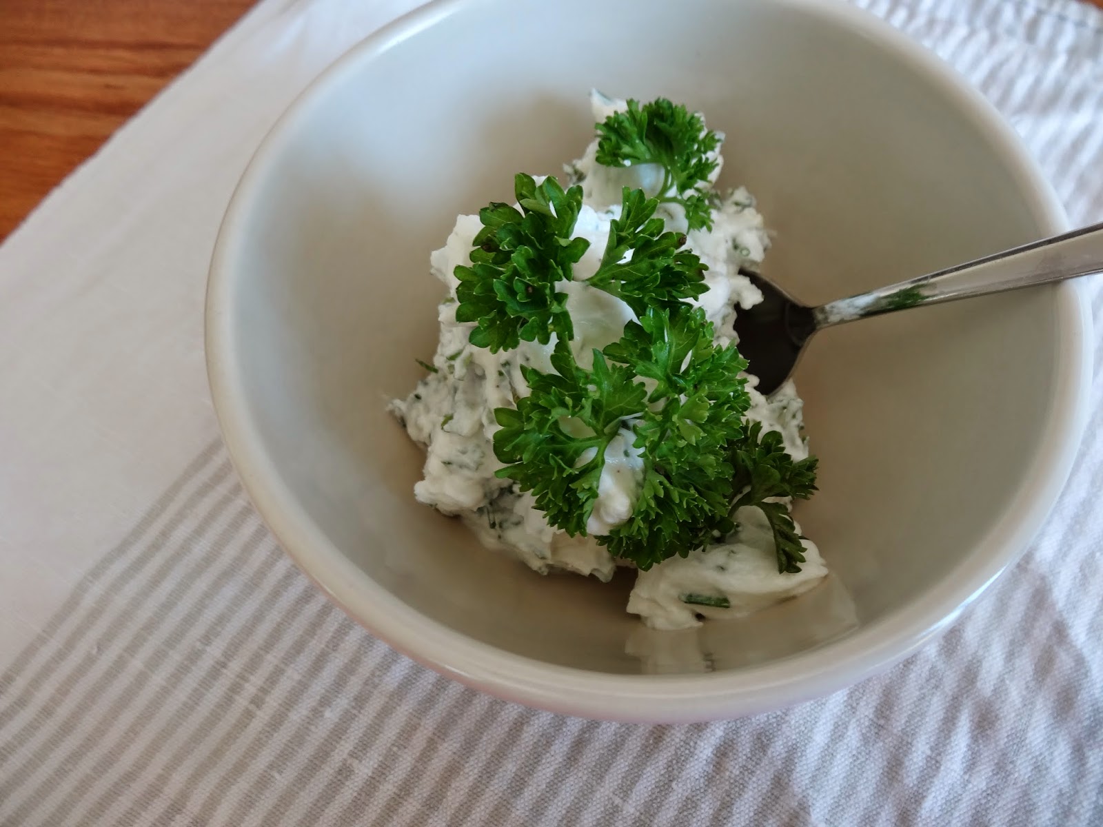 Blanda i en pressad vitlöksklyfta i kvargen. Skölj örterna och skär dem smått. Blanda i, rör om. Smaksätt med salt och peppar.