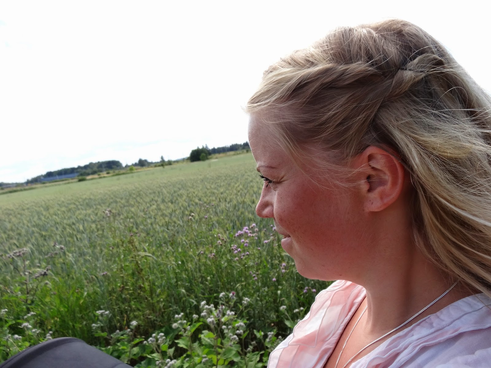 Jag gick längs med fält och fick anpassa min väg efter hur solen låg. Det var mestadels soligt under promenaden och barnen låg och sov åt olika håll. De gångvägar som ligger närmast vårt hus är vägar som ligger vid öppna fält och längs bilvägar. Det kan därmed vara svårt att promenera i skugga när solen står högt. Inte helt optimalt med en nyfödd i vagnen.