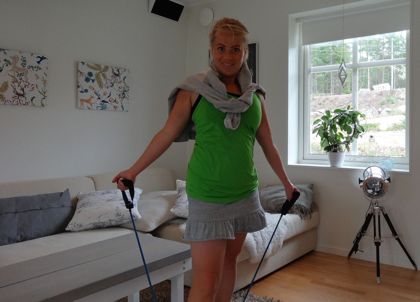 Hade inte bara träningskläder på mig, utan vanlig kjol tillsammans med NIKE-linne och sporttopp underst. Fungerade bra att träna med gummibanden och några MammaMage-övningar i. Kan rekommendera denna typ av kläder om du ska hinna träna på kort tid och sedan ska iväg på brunch och lekparkshäng. Behövde dock också en tröja på mig då det inte har varit så varmt ute idag.
