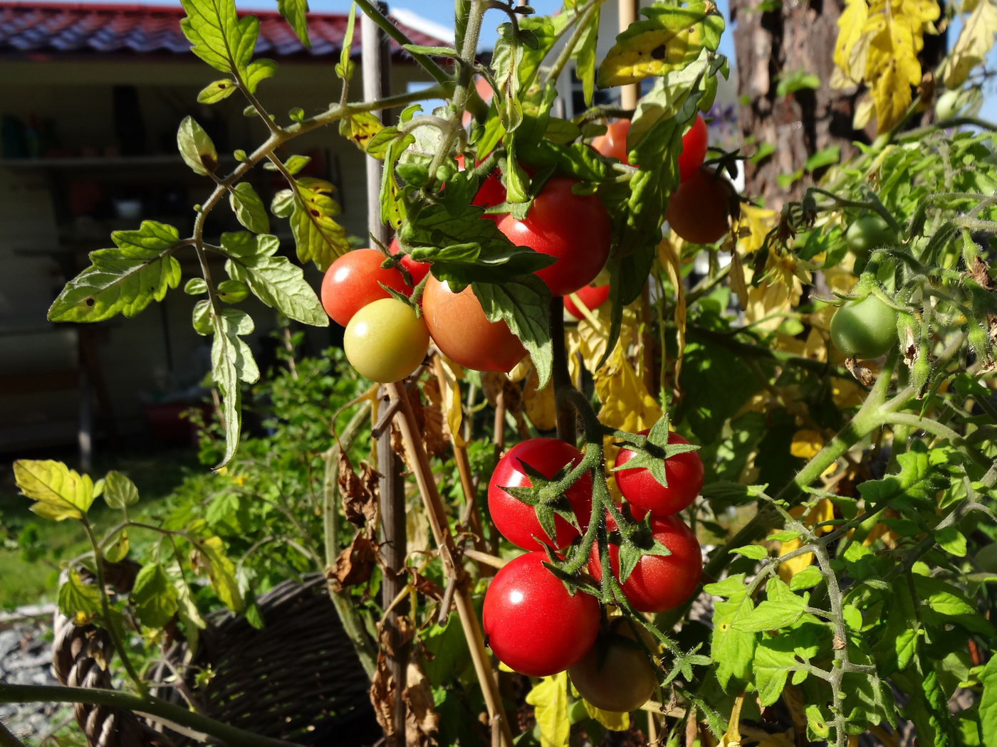 När jag fotograferade plantan såg den inte så rolig ut med alla gula blad. Men de har jag klippt bort nu. De röda, fina tomaterna lyser dock upp fint. Och efter att vi plockade av dem dröjde det bara en dag innan fler blev lika röda.
