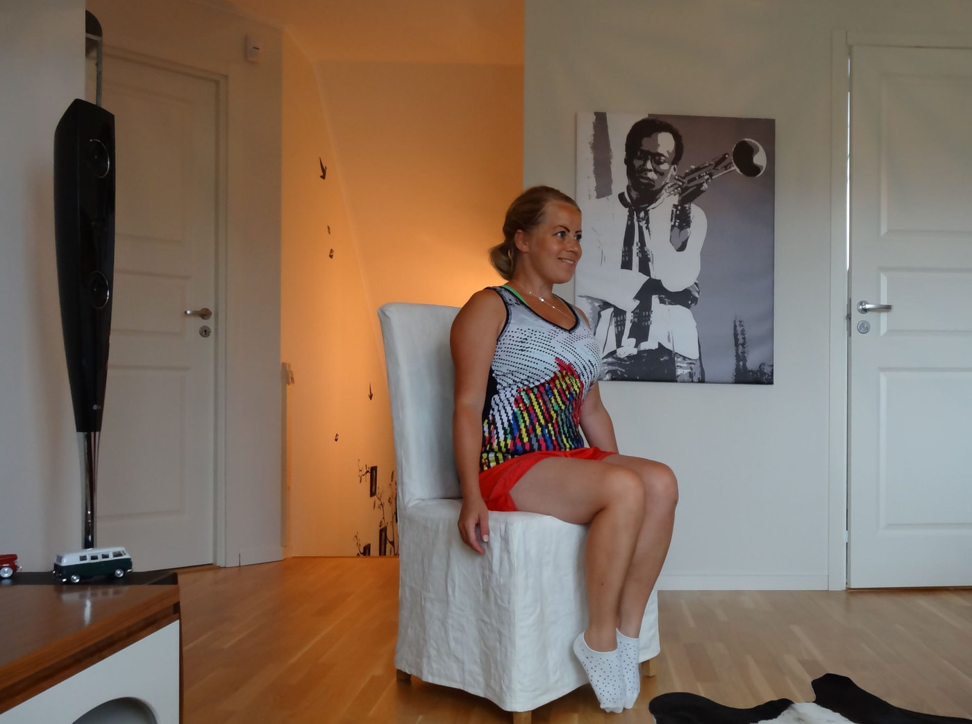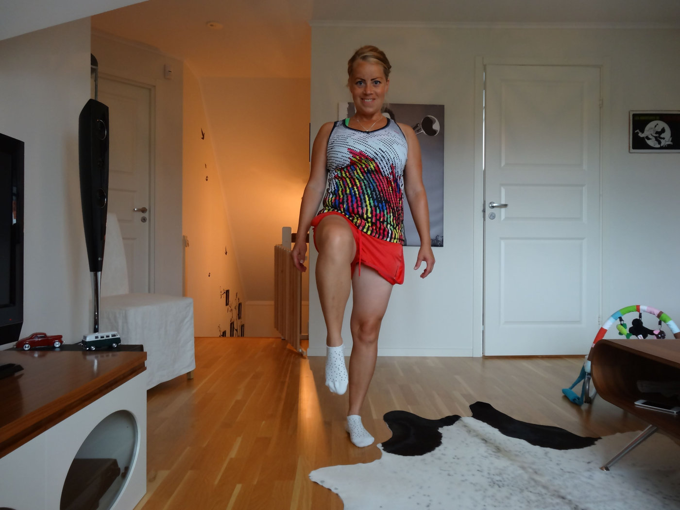Övningarna idag var som sagt enkla och inte så ansträngande. Så det fick bli några armhävningar som avslutning. Har inte gjort några sådana på minst ett halvår så det var kul att testa mig. Jag kunde konstatera att jag är starkare i den övningen nu än jag var två månader efter förra graviditeten. Orkade göra 12 på fötterna och direkt därefter 12+12 på knäna. Är ganska säker på att jag i det stora hela är starkare nu än sist jag var postgravid och det är viktigare än vad jag väger eller hur mycket lös hud jag har.