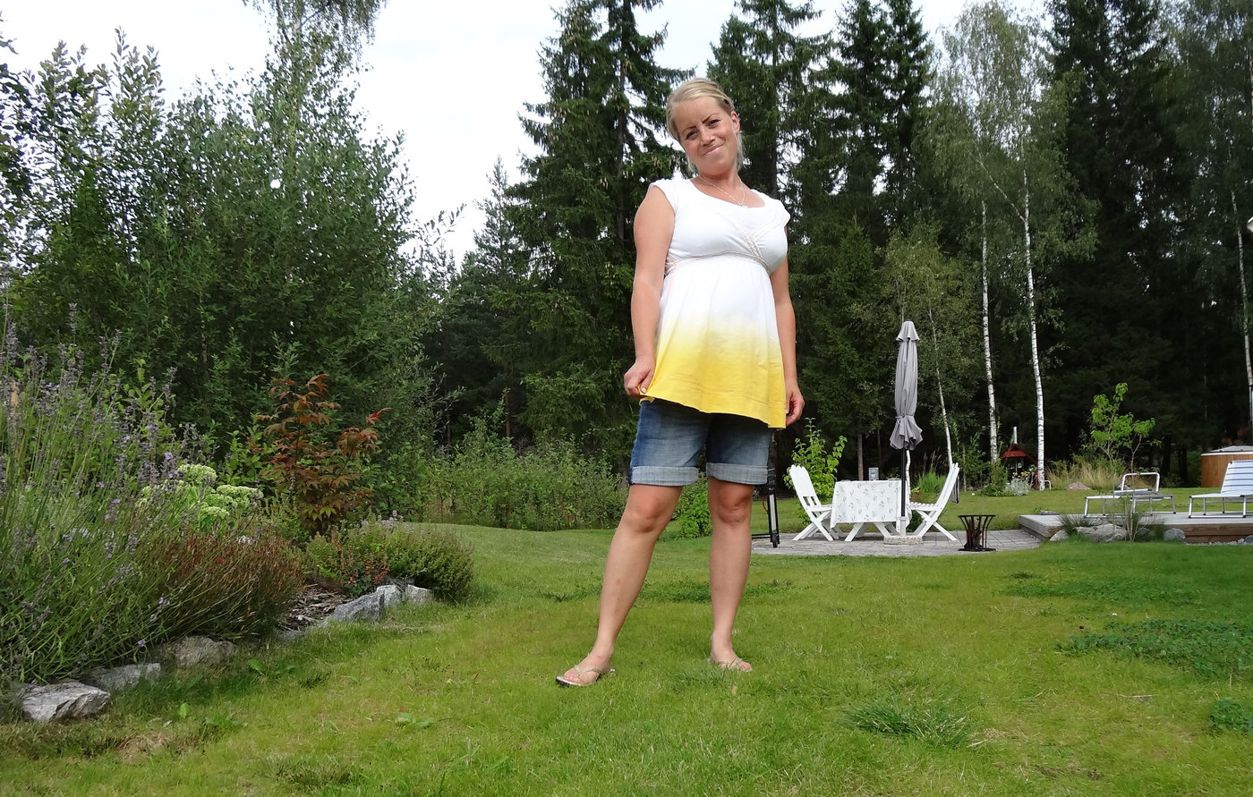 Jag går runt i kläder som är pösiga och inte visar så mycket, dels för att jag inte kan ha mina vanliga, tajta kläder ännu och dels för att jag vill visa så lite som möjligt av magen. Med ett linne eller en klänning som döljer det mesta känns det inte lika jobbigt. Jag säger att jag tycker det är tråkigt att jag inte kan bada denna sommar på grund av snittet, men egentligen är jag ganska glad för det. För jag har verkligen ingen lust med att visa mig på badstranden.