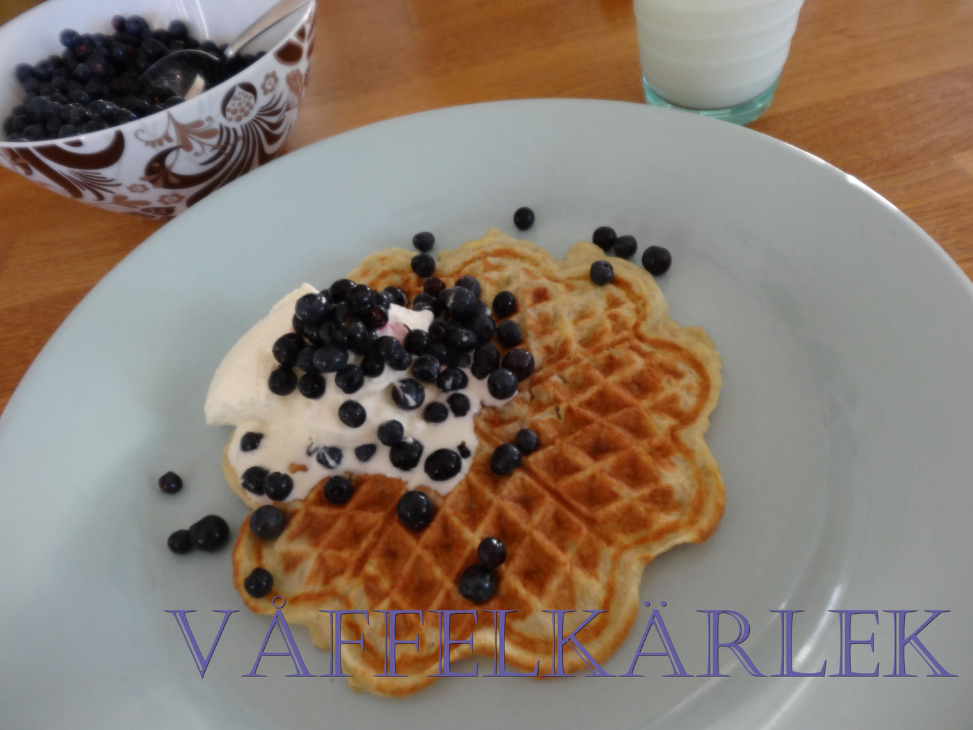 Njutningsfullt goda med vispad grädde och skogens blåa bär till. Nu har vi något gott som variation till pannkakor att äta allt ibland. Och jag vet precis vad vi kan äta på våffeldagen nästa gång!