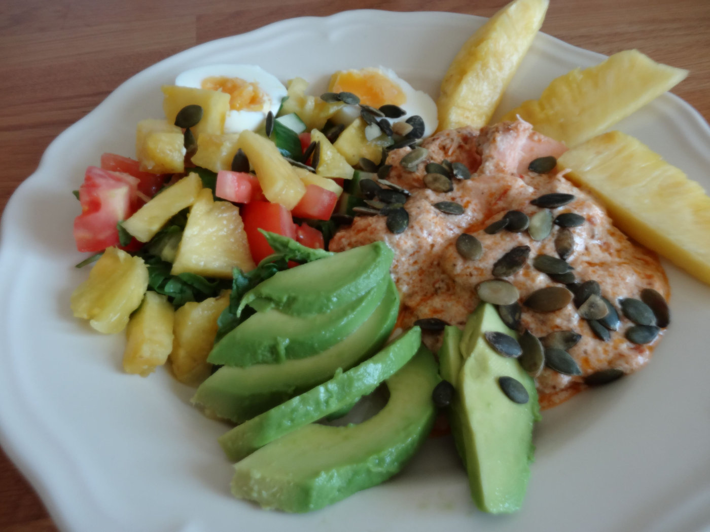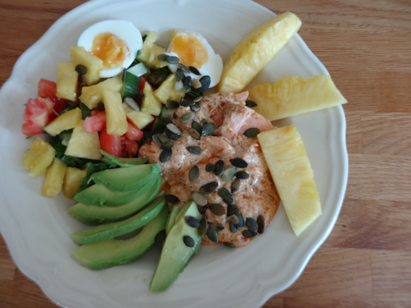 Hemma igen åt vi lunch och Wilmer fick välja pasta och köttfärssås. Jag fick också välja min lunch. Vi hade rester av lax kvar hemma så för mig blev det lax och annat gott som ananas, avokado och ägg.