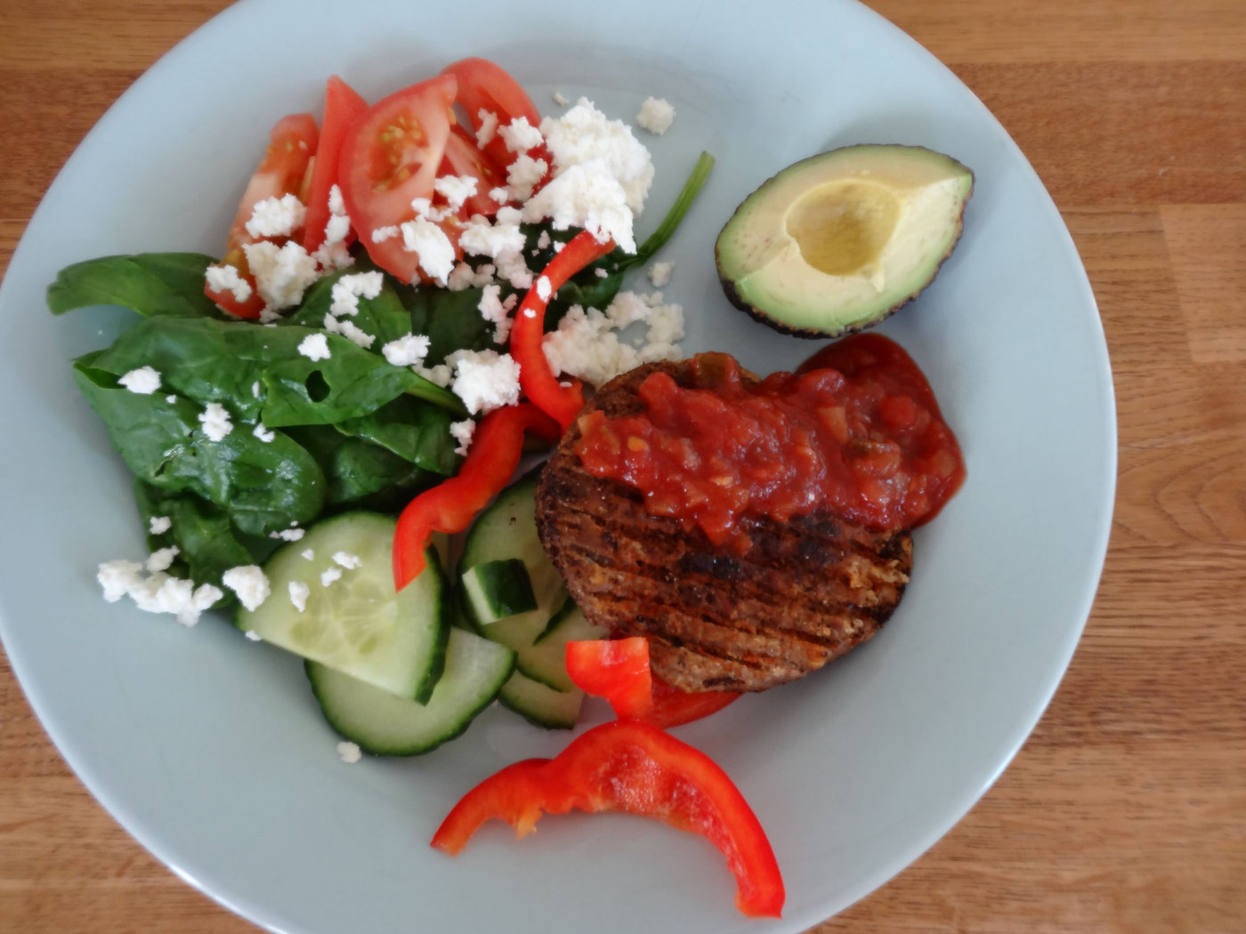 Igår åt jag burgaren tillsammans med grönsaker, avokado, tacosås och fetaost.