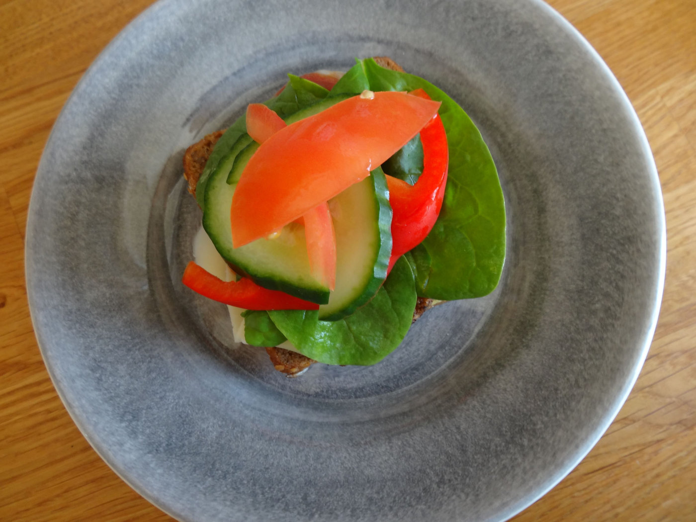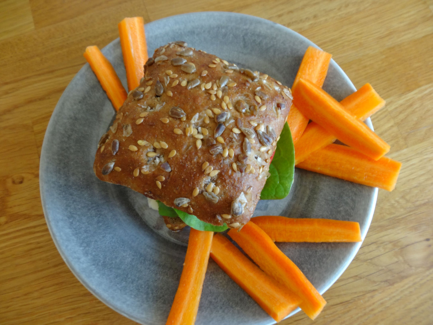 Jag tog en Fazer Frökuse, bredde dijonsenap på den undre halvan, lade på en burgare, skivade ost och lade på den så att osten smälte. Sedan toppade jag med tacosås, bladspenat, gurka och tomat. Och till sist på med den övre brödhalvan. Till detta: morotsstavar.