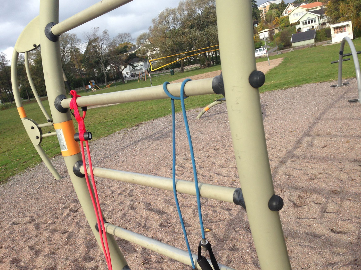 Jag hade tagit med mig gummiband som mammorna tränade roddövningar med så de använde jag i min egna träning. Det blev rodd för mig också, men även övningar för axlarna. Jag tränade också latsdrag, dips mot bänk och upphopp tills jag kände mig lagom mör.