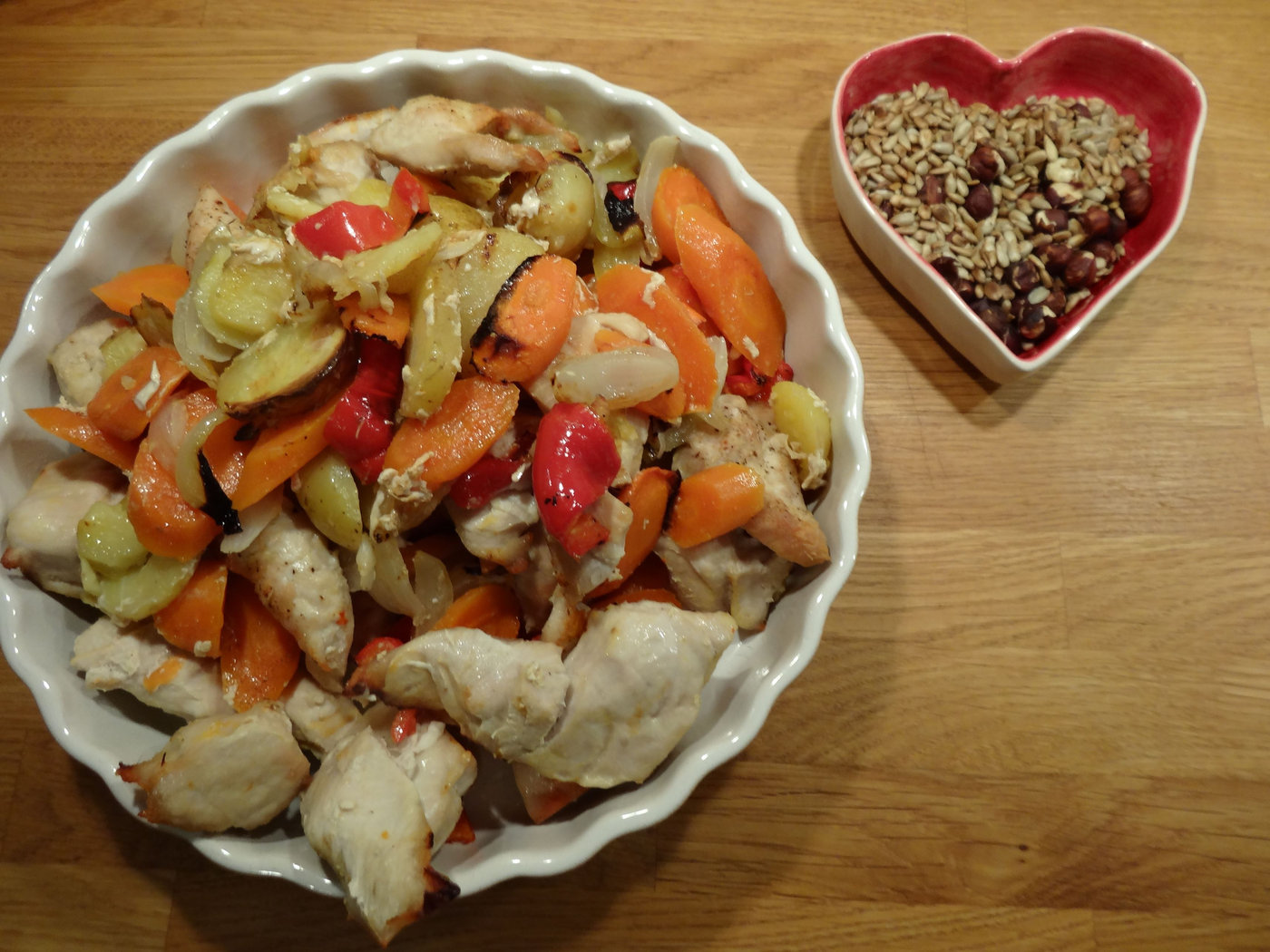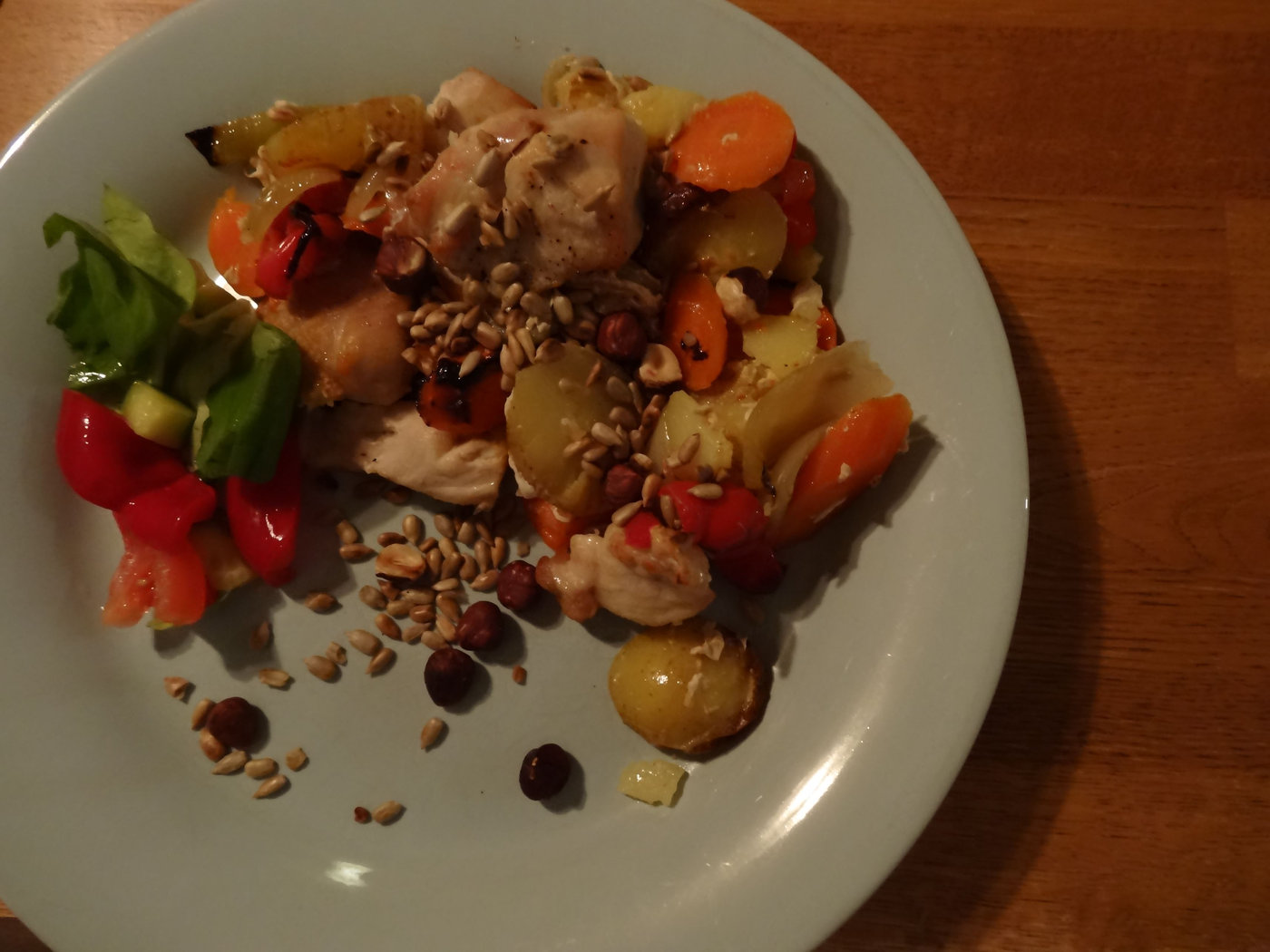 Jag gillar bäst att laga mat, som räcker till fler än en gemensam måltid. Det sparar både energi och tid. För två dagar sedan lagade jag kyckling, rotfrukter och grönsaker på en plåt i ugnen. Går ju smidigt och enkelt eftersom det sköter sig själv. Under tiden rostade jag solrosfrön och hasselnötter i en torr stekpanna.