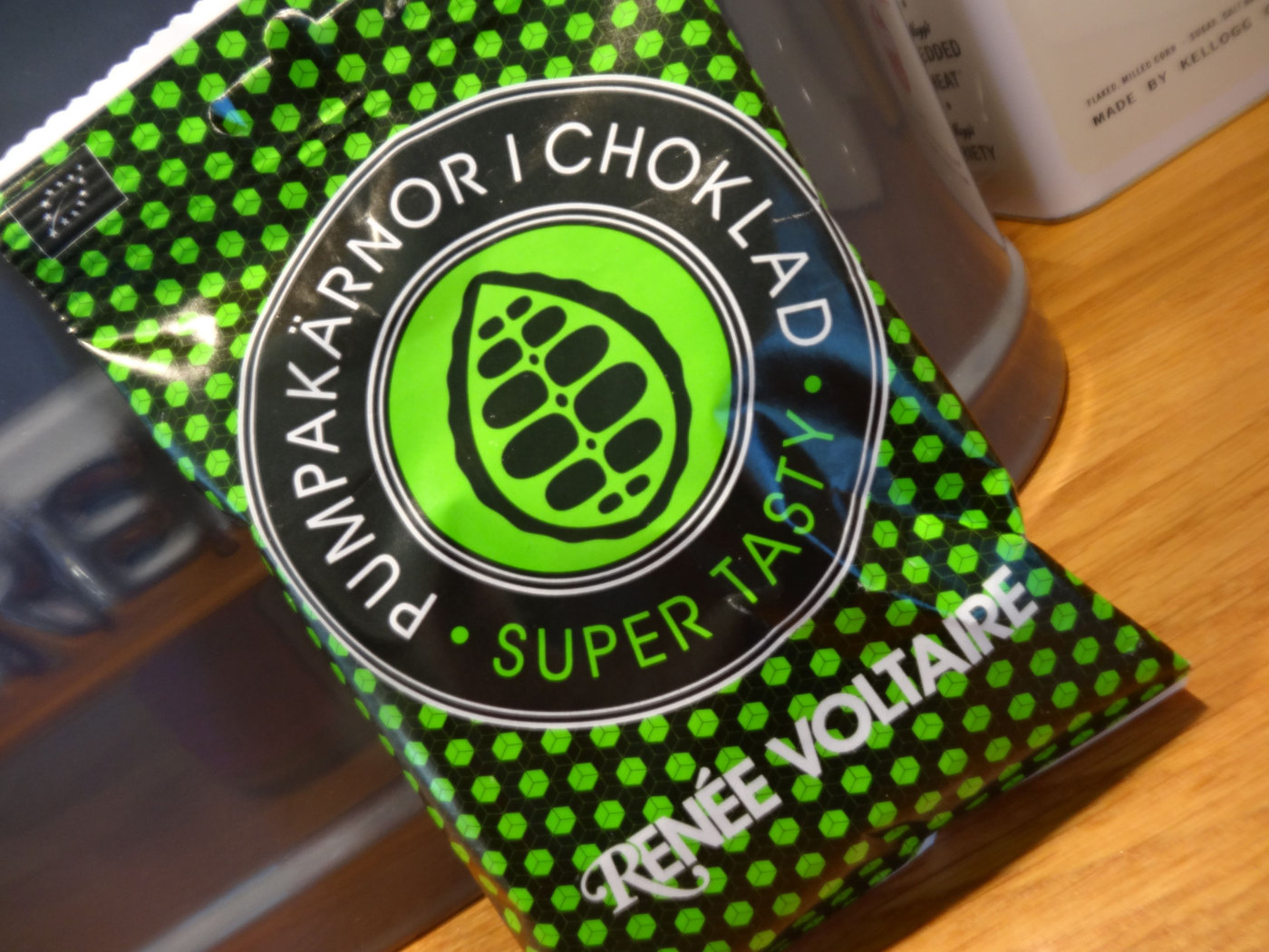Har också en påse med chokladdoppade pumpakärnor att smaska på. Goda precis som allt annat Renée Voltaire har i sitt utbud. Får tacka syster för dessa!