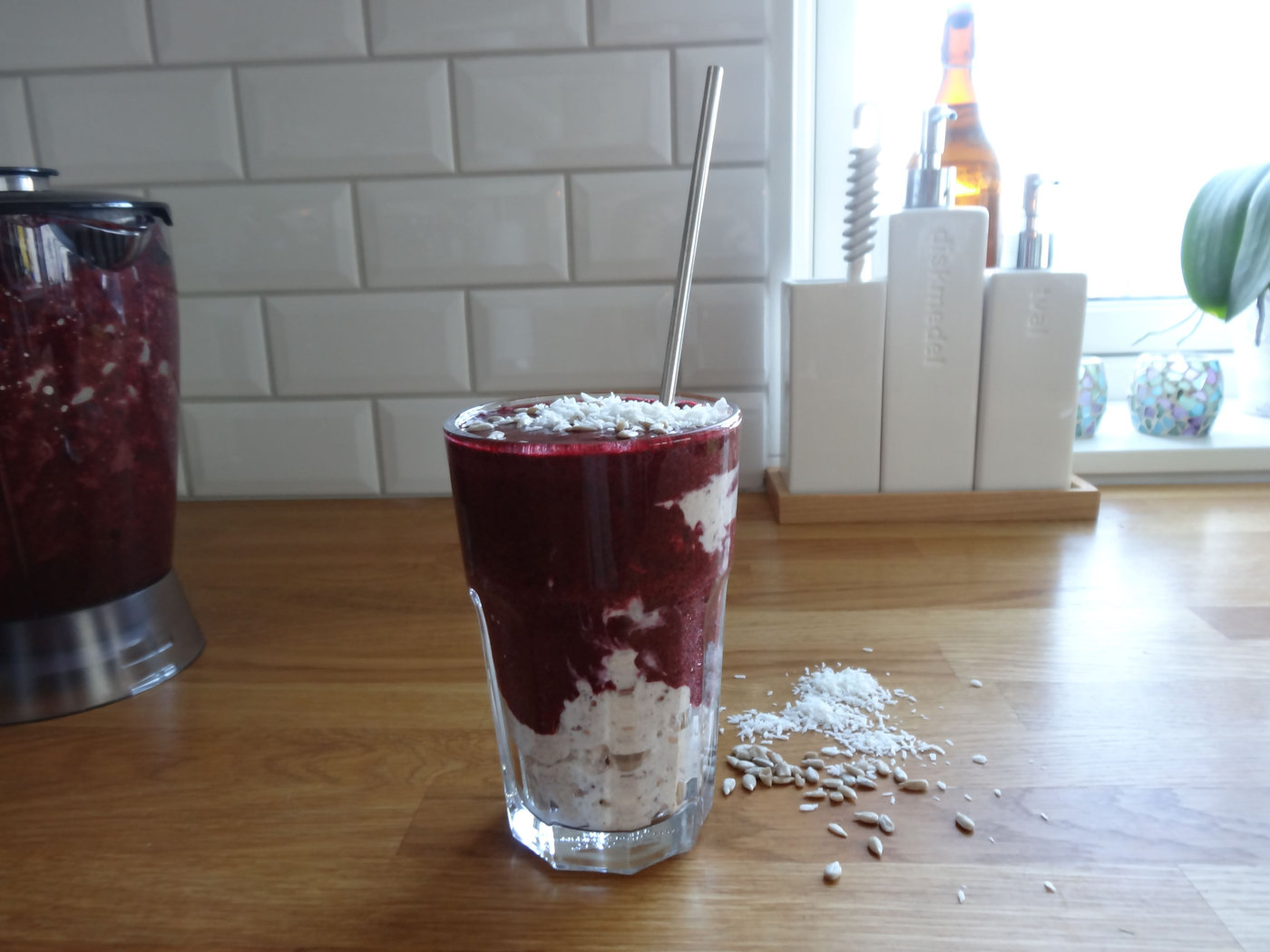 Igår kväll gjorde jag i ordning gröten genom att blanda yoghurt med fiber havregryn, kanel och krossade linfrön. Detta fick sedan stå i kylen över natten och gotta till sig. I morse mixade jag bär med banan till en kräm och kunde sedan servera detta i ett glas. Här kommer receptet med ingredienser och proportioner ifall ni vill testa.