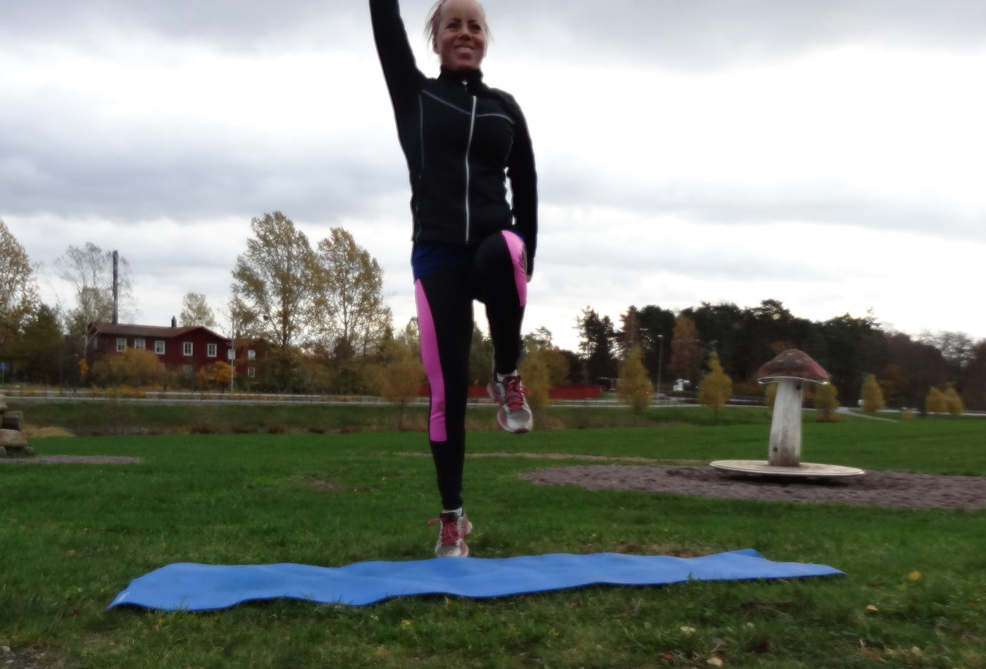 2. Dra överkroppen uppåt och gör ett upphopp genom att böja det bakre benet och hoppa upp med det andra. Sträck upp motsatt arm i luften.