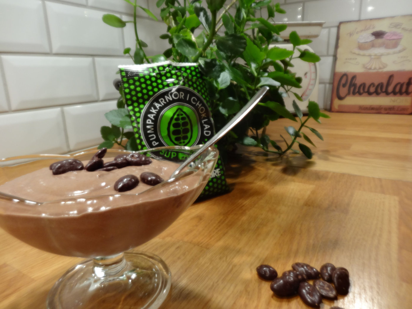 Jag toppade min glass med chokladöverdragna pumpafrön.