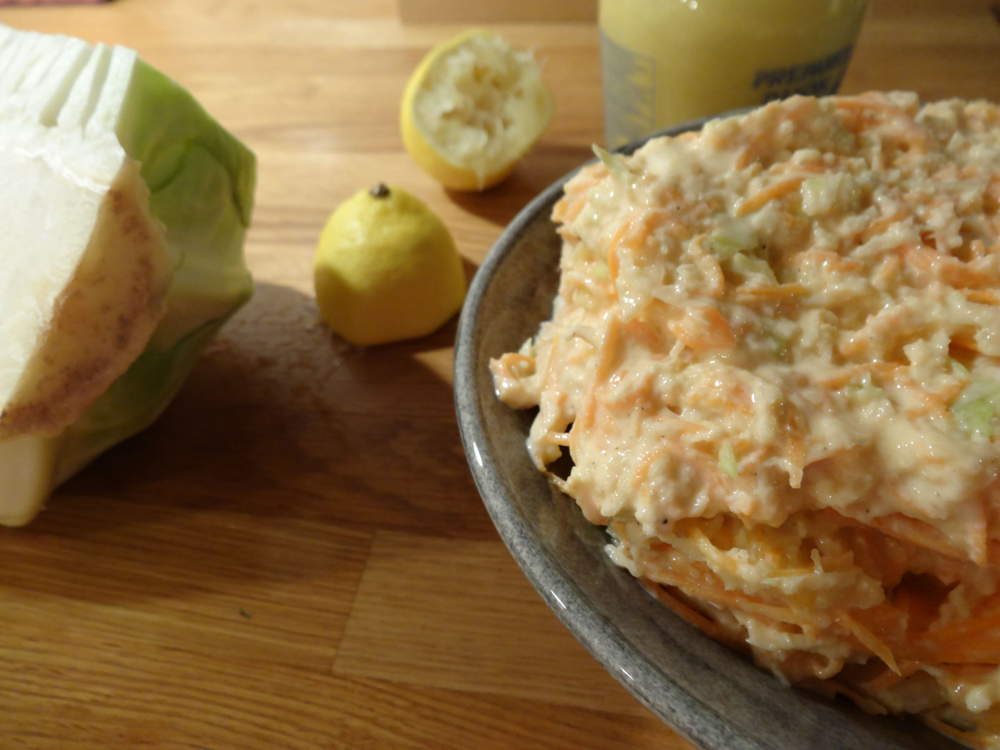 Skala morötterna, riv dem och vitkålen. Blanda i övriga ingredienser. Smaka av så att du får rätt balans av senap, citron och peppar.