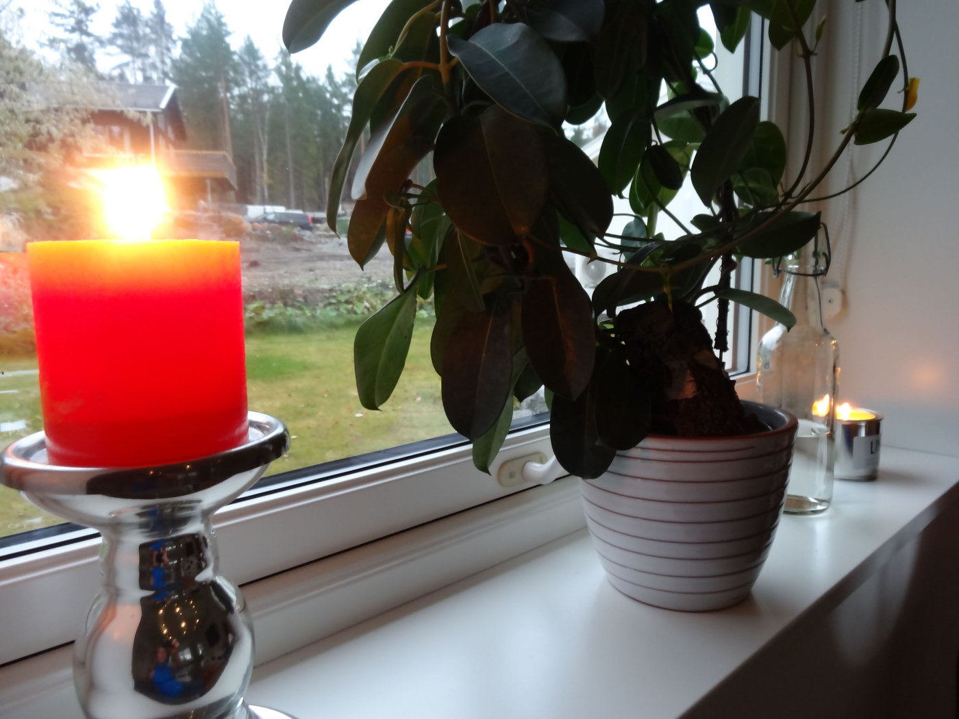 … och ett orange ljus, som vi pyntat med för Halloween (det enda Halloween-pynt som har fått komma fram hos oss. Är inte så mycket för att fira denna ”högtid”…) och några andra ljus.