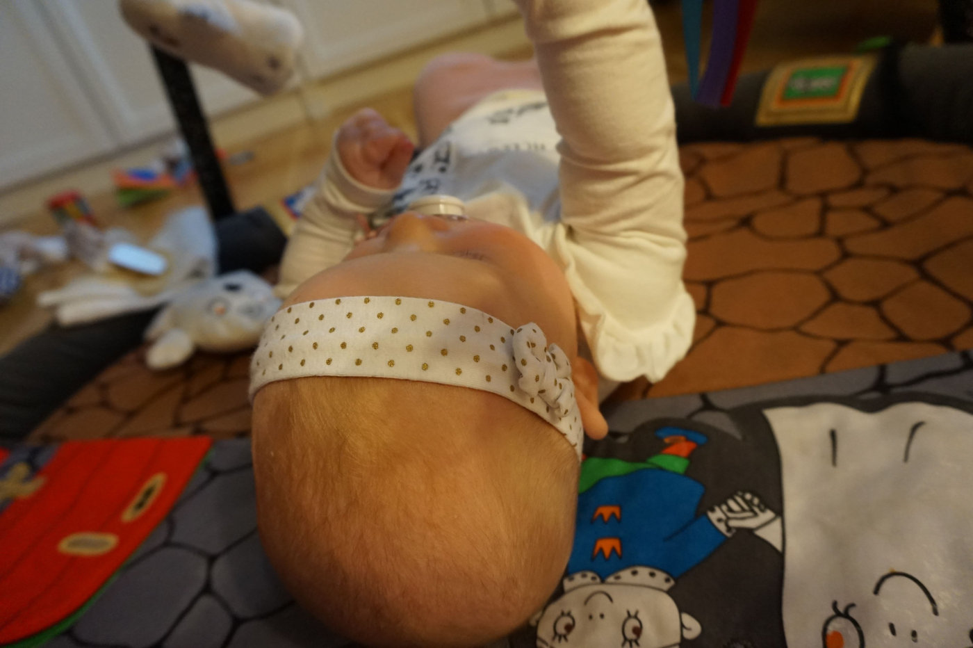 Nu när vi kör mammaträningen inomhus kan bebisarna vara på en filt på golvet under tiden. Fungerade klockrent idag och efteråt roffade Smilla åt sig mina träningsskor. 🙂