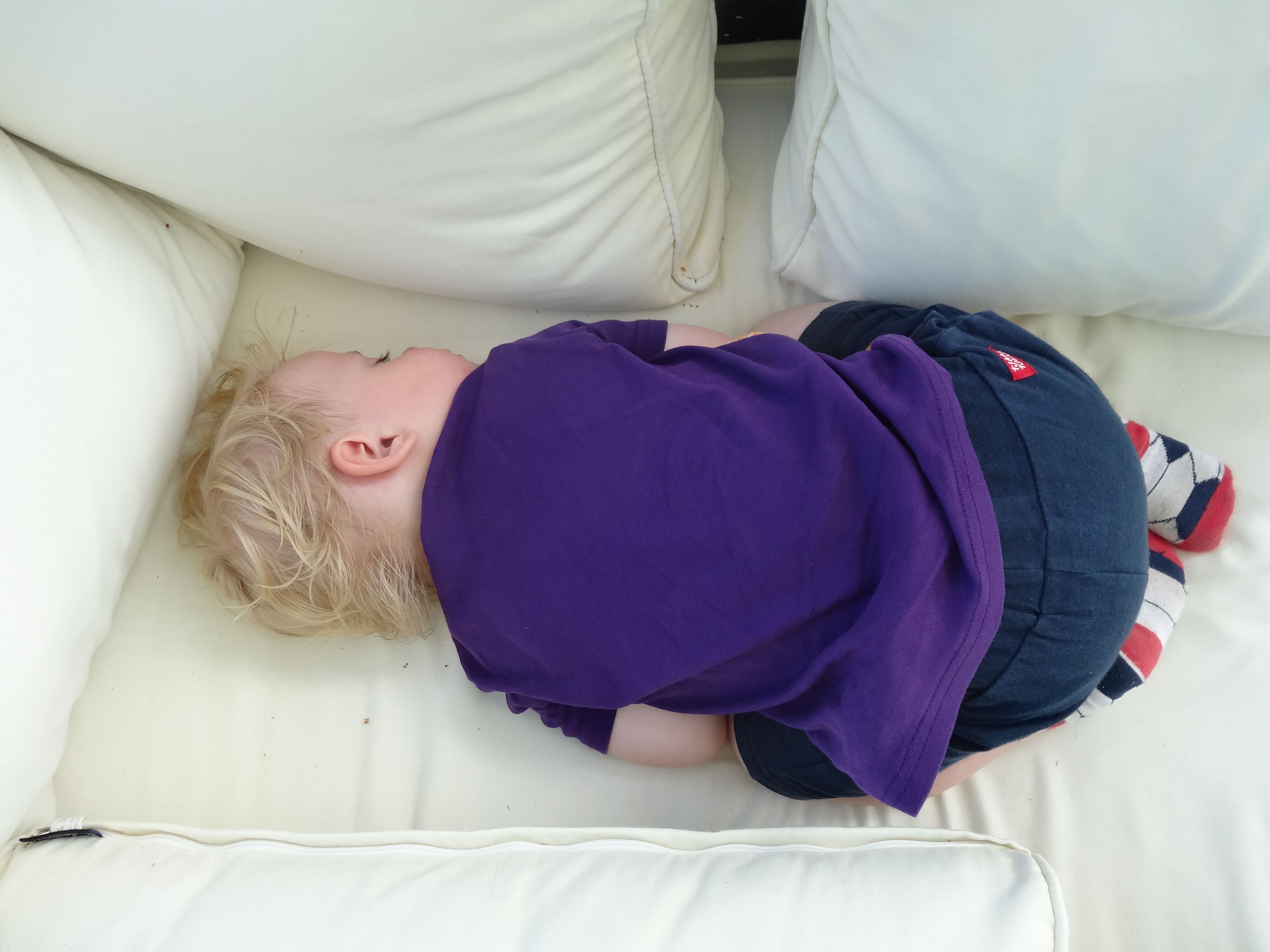 Storebror i familjen har slutat sova middag hemma sedan ungefär ett år tillbaka. Men på förskolan sover han en timme mitt på dagen och om han är riktigt trött när han är hemma brukar han slockna en stund då med. Bilden på honom är från en svettig dag i somras när han hade kört slut på sig själv och stupade i soffan och sov där en bra stund. Sedan var han igång igen.