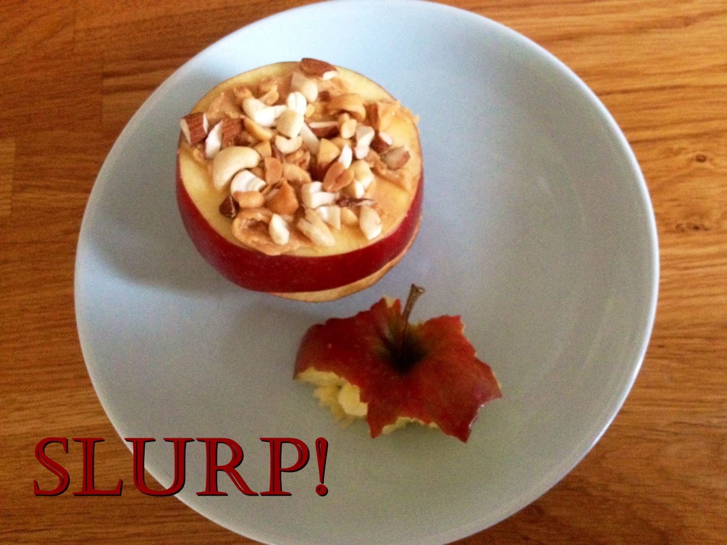 Här kommer det som just nu är en absolut favorit i mellanmålsväg för mig. Ta ett stort, rött äpple. Skär det i tre delar. Bred jordnötssmör på äppelbitarna och garnera med hackade nötter och/eller mandlar. Den här gången blev det cashewnötter, jordnötter och mandlar i hacket.