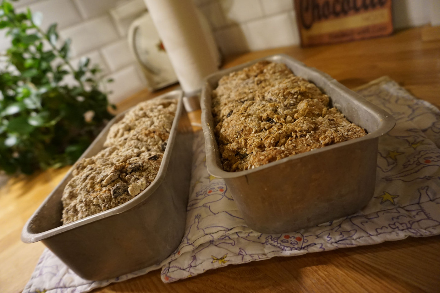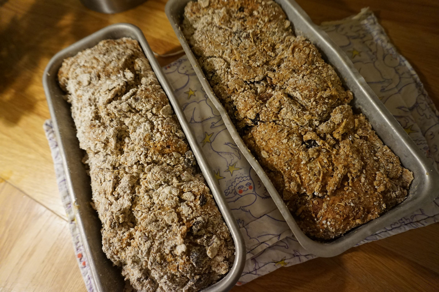 Grädda i nedre delen av ugnen i ca en timme. Eventuellt kan du behöva täcka bröden med aluminiumfolie efter ungefär halva tiden för att inte bränna skorpan. Känn efter med en sticka att bröden är klara. Om stickan inte blir kladdig när du sticker ner den kan du ta ut bröden. Låt dem svalna på galler under en handduk.