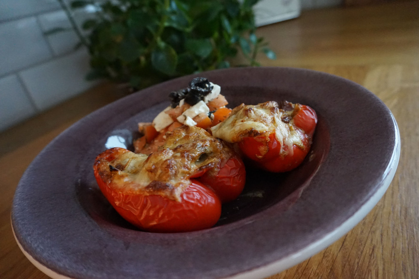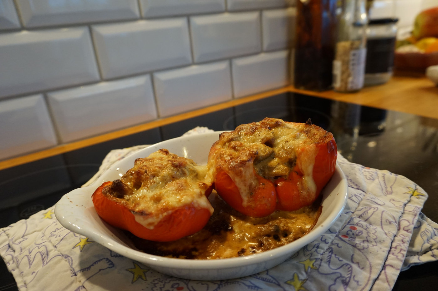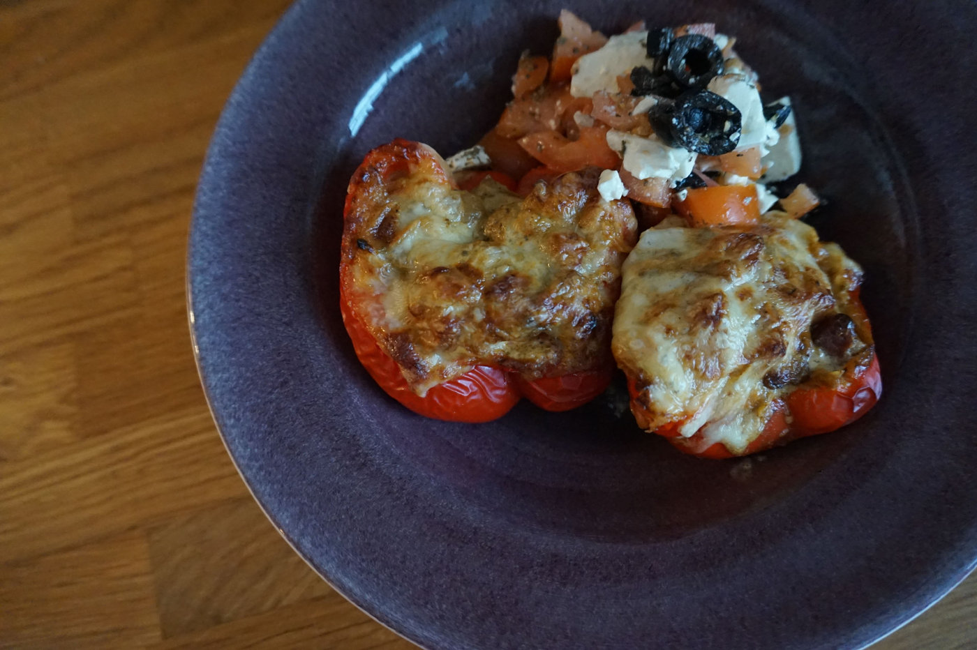 Jag skar helt enkelt en röd paprika mitt itu och fyllde halvorna med såsen. Har man överbliven köttfärssås, någon kycklingröra eller liknande hemma så fungerar det lika bra att ta den. Jag skivade en skiva ost till vardera halva och lade på. Sedan in i ugnen på 200 grader i ca en halvtimme. Jag tog ut dem när osten hade blivit ordentligt gratinerad och paprikan var mjuk.