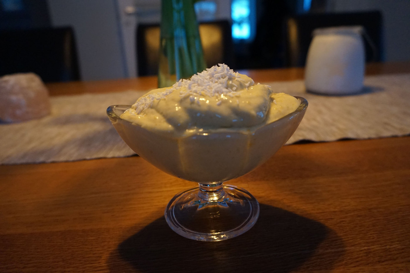 Jag toppade glassen med kokosflingor och njöt av i TV-soffan. Kan tänka mig att det är gott att även strö hackade jordnötter på. Eller kanske ha en klick jordnötssmör i glassen.
