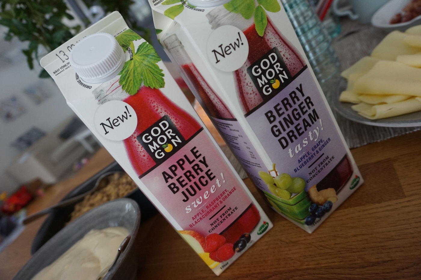 Innan dess drack vi av två juicenyheter från God Morgon – handplockade frukter och bär som har pressats inom 24 timmar. De innehåller mycket fruktkött och är tänkta att förgylla helgfrukosten. Jag gillade den med äpple och bär bäst. Den andra som innehåller ingefära kan bli lite för intensiv i smaken för min del.