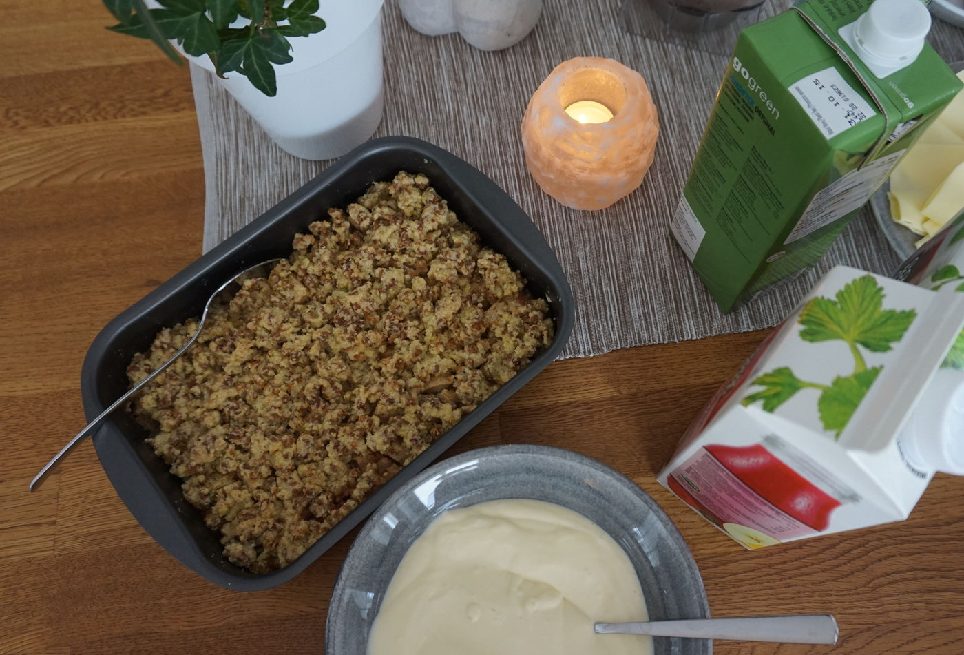 Min syster hade tagit med sig en vegansk äppelpaj gjord på granola, hirsflingor, äpplen, socker och margarin. Den söta godbiten fick avsluta brunchen.