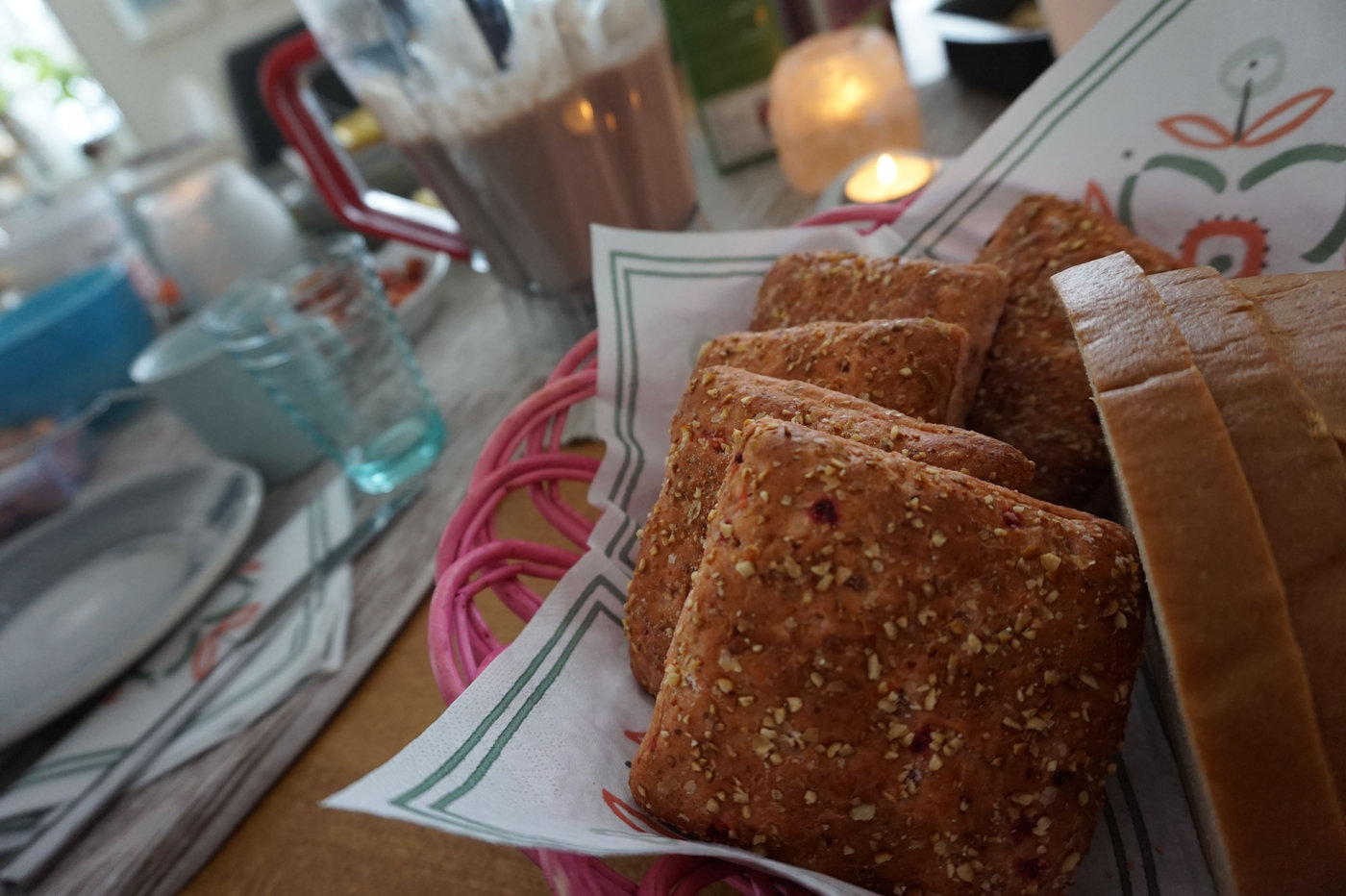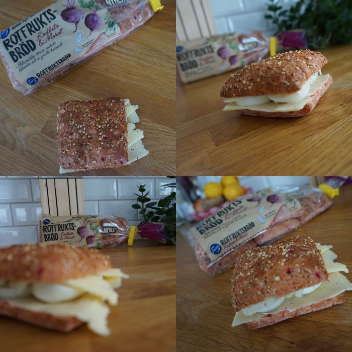 Nyheter hittar man just nu också i Fazers brödsortiment. Till brunchen åt vi av rotfruktsbrödet med rödbeta och morot. I detta bröd har man satsat på att ha med mer grönsaker och mindre mjöl. Det vi åt av innehöll kidneybönor förutom rotfrukterna, men ändå smakade brödet precis som vilket bröd som helst. Super bra om man vet med sig att man äter för lite grönsaker och rotfrukter.