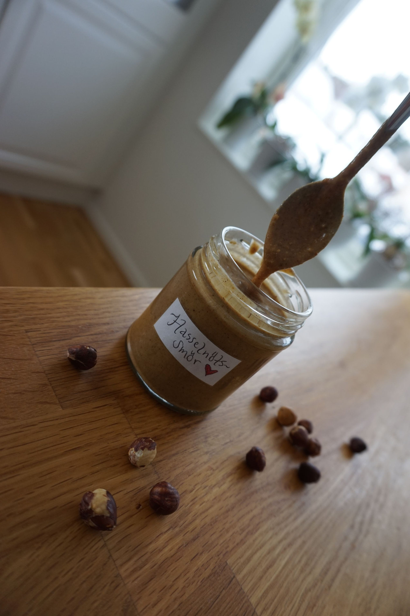 Häll upp hasselnötssmöret i en burk och förvara svalt. Av de 200 gram hasselnötter jag mixade fyllde de upp denna burk puls att jag fick lite till över.