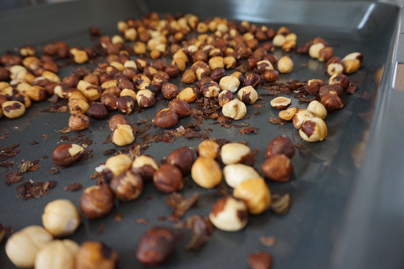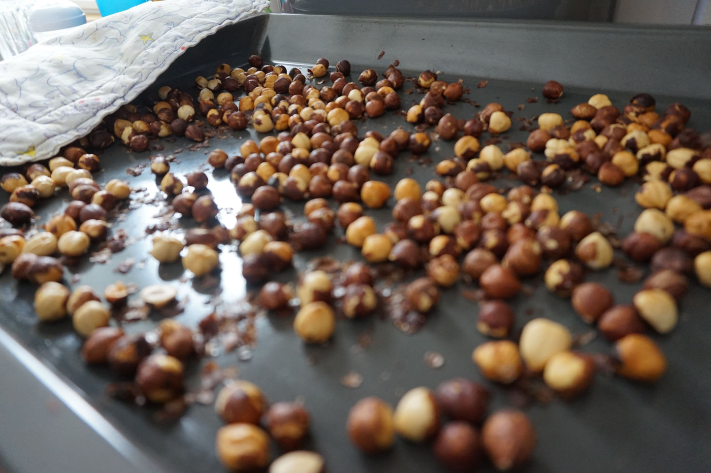 Låt nötterna svalna på plåten. Ta sedan en handduk och gnugga dem lätt med den så att skalen faller bort. Nötterna behöver inte vara helt utan skal, men borsta bort så mycket skal som möjligt.