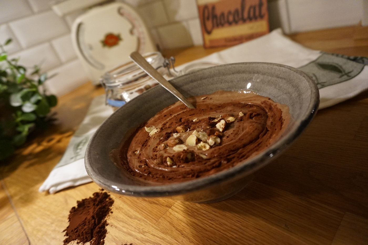 Hacka hasselnötterna och garnera med dem. Strö eventuellt över lite kakao. Njut den som sagt när den är lite smält. I alla fall tycker jag att det är godast.