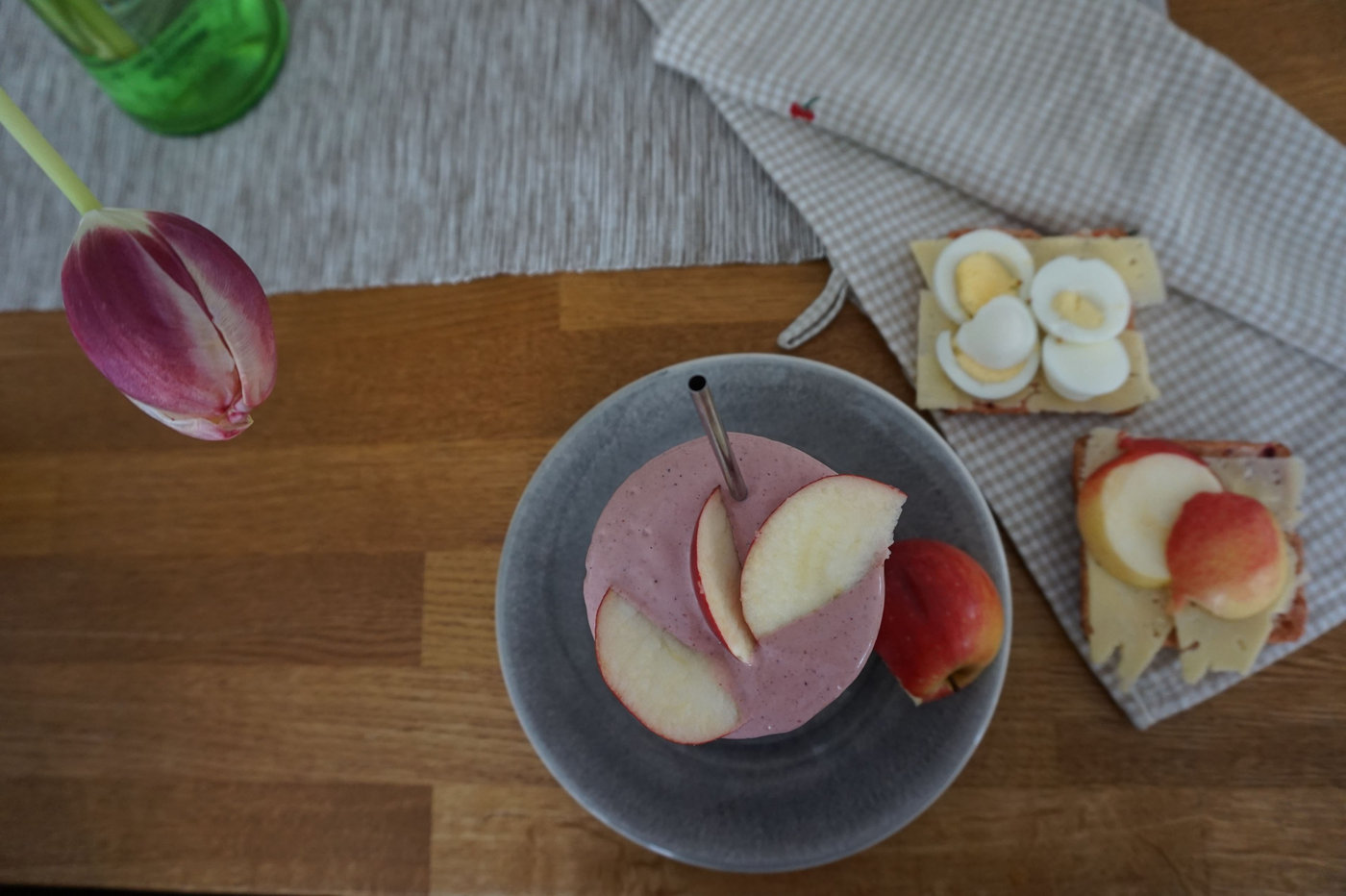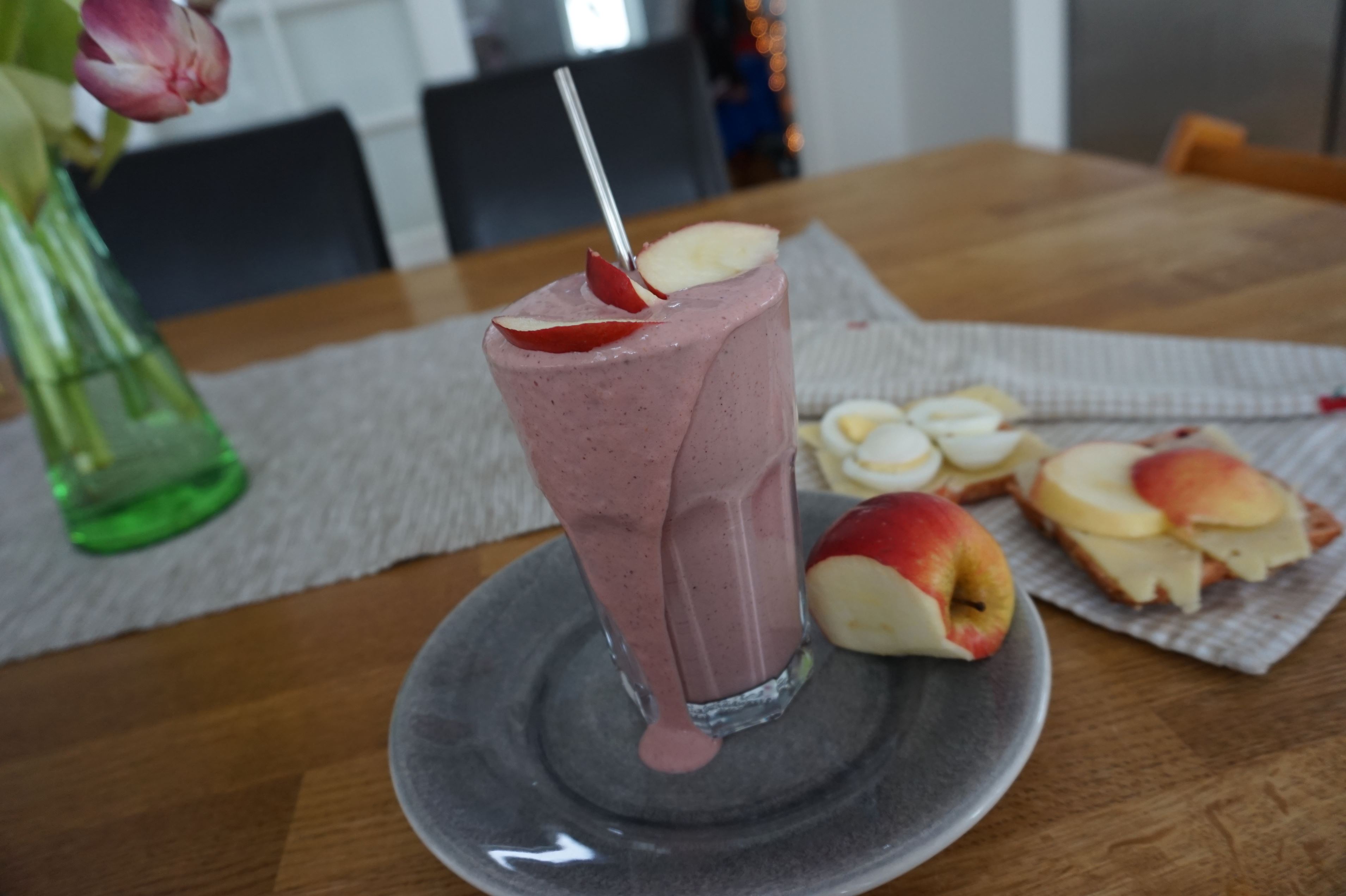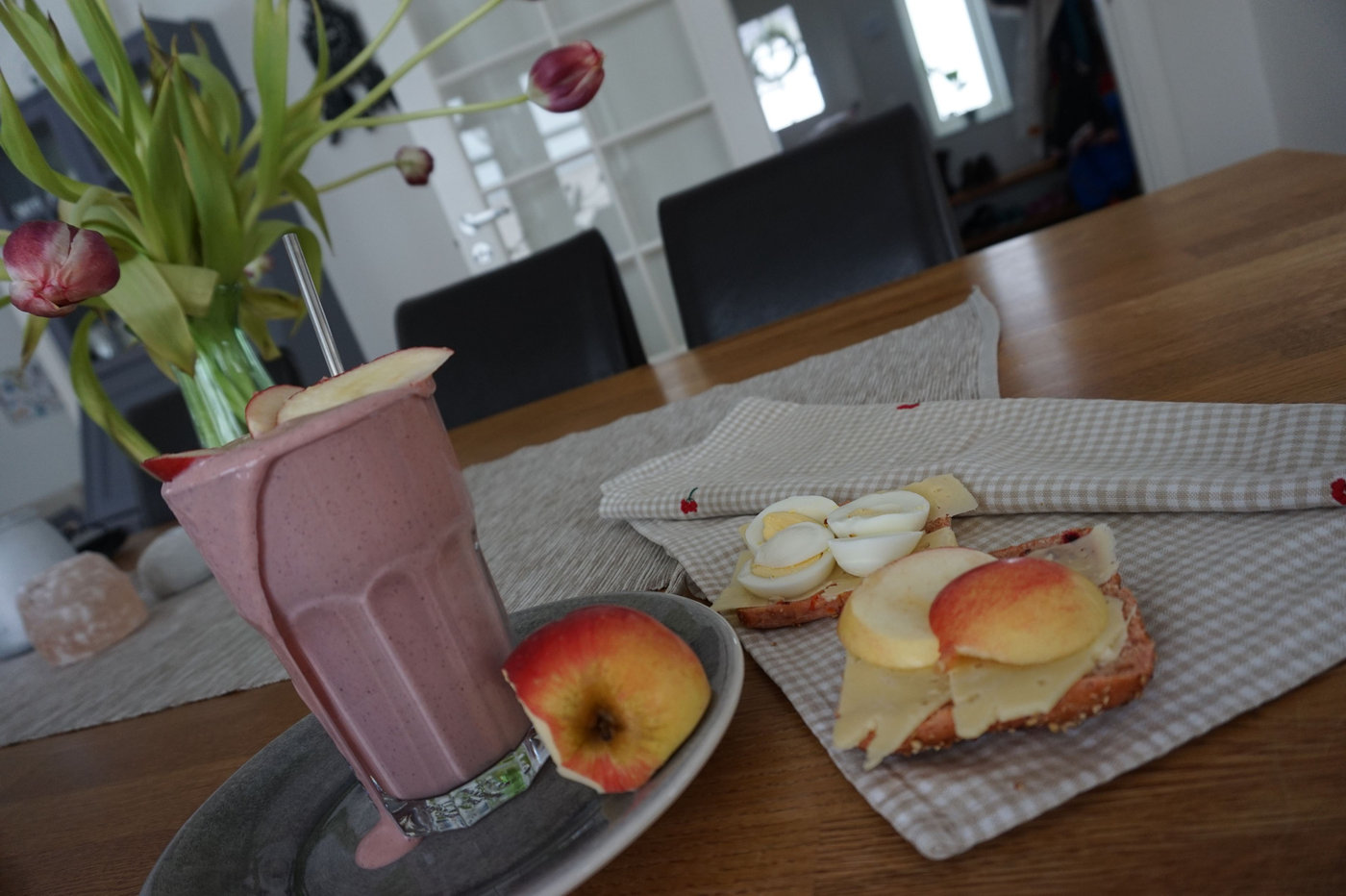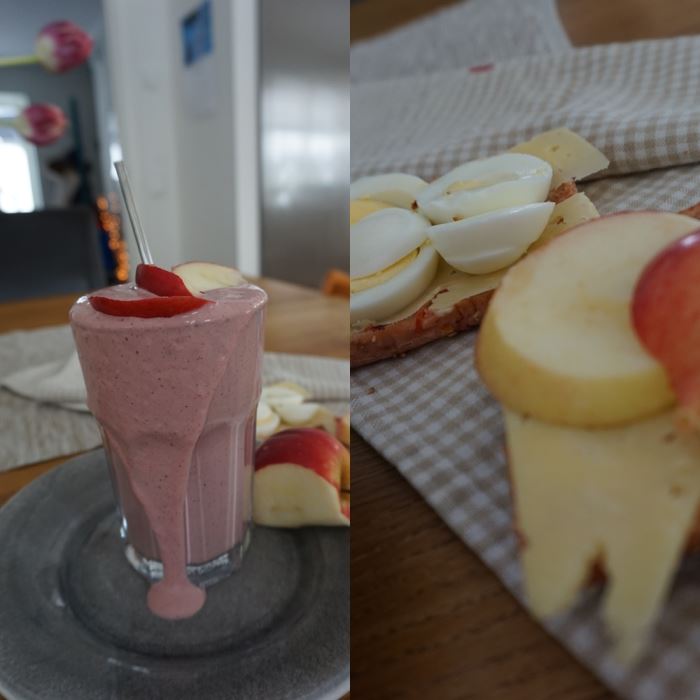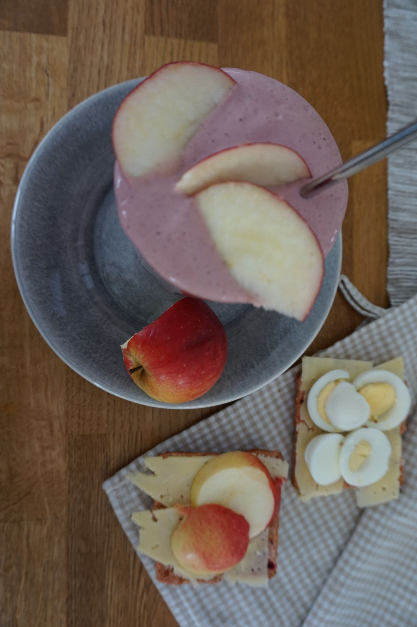 Till min smoothie åt jag matiga smörgåsar med ost och ägg. Och så ett äpple till det.
