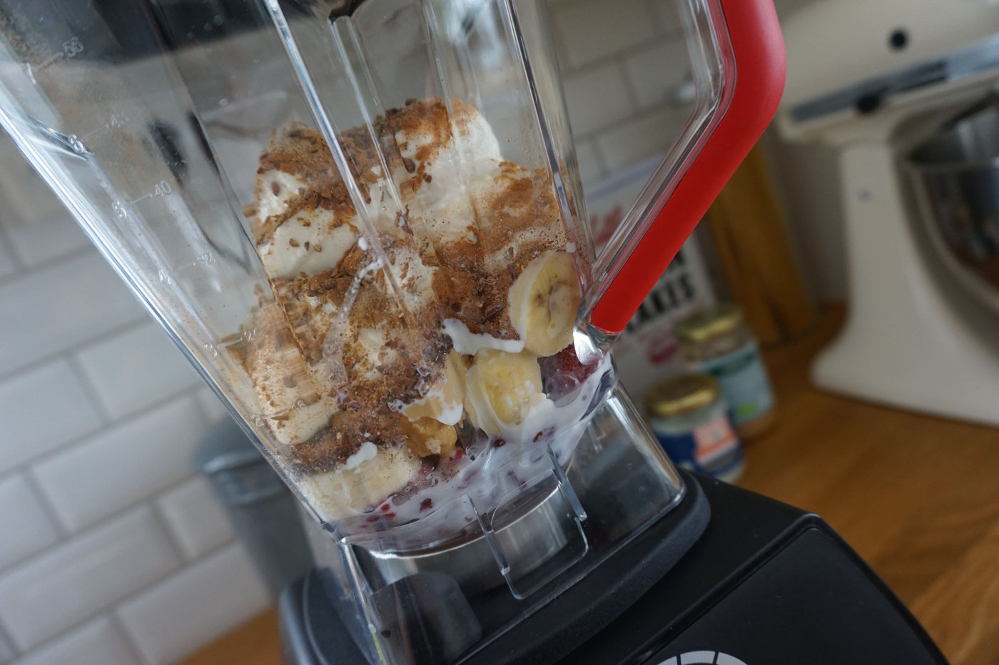 När jag testade den igår hällde jag i allt möjligt gott: frysta bär, banan, kvarg, kokosolja, jordnötssmör, linfrön och mjölk. Mix, mix och vips hade jag en len och härlig smoothie!