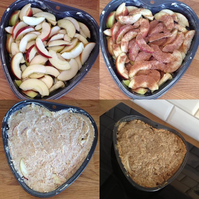 Skölj och skär äpplena i mindre bitar. Smörj en form med smör och fördela äpplena där. Strö över stevia och kanel. Fördela smuldegen jämnt över frukten.