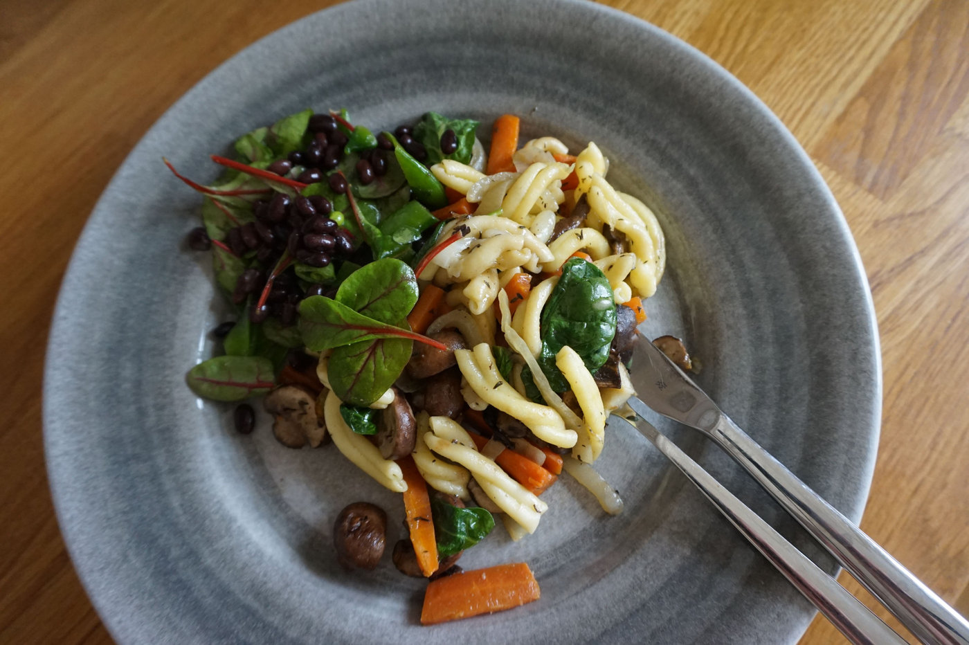 När rotfrukterna och svampen är klar häll dem över pastan tillsammans med riven ost och smör. Blanda. Servera detta tillsammans med salladen.