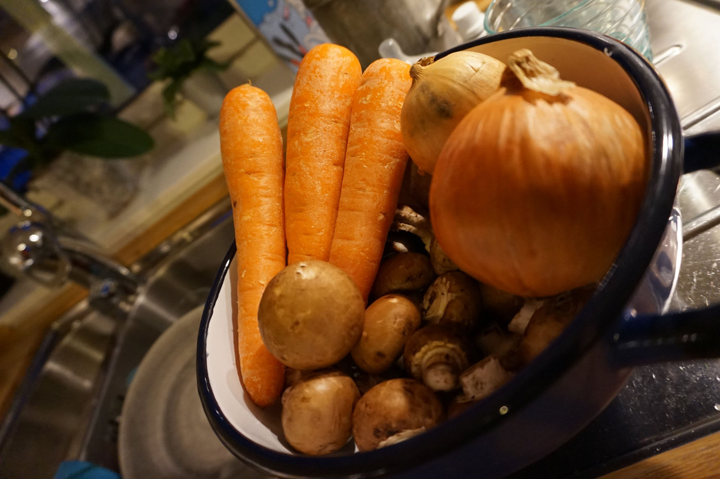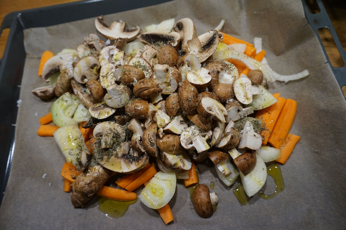 Skala och skär morötter i stavar. Skala och skär lök i halvmånar. Grovhacka portabellosvamp och skär champinjoner i skivor. Lägg allt i en ugnsfast form eller plåt, ringla över olivolja och krydda med timjan och salt. Stek mitt i ugnen i ungefär 15 minuter.