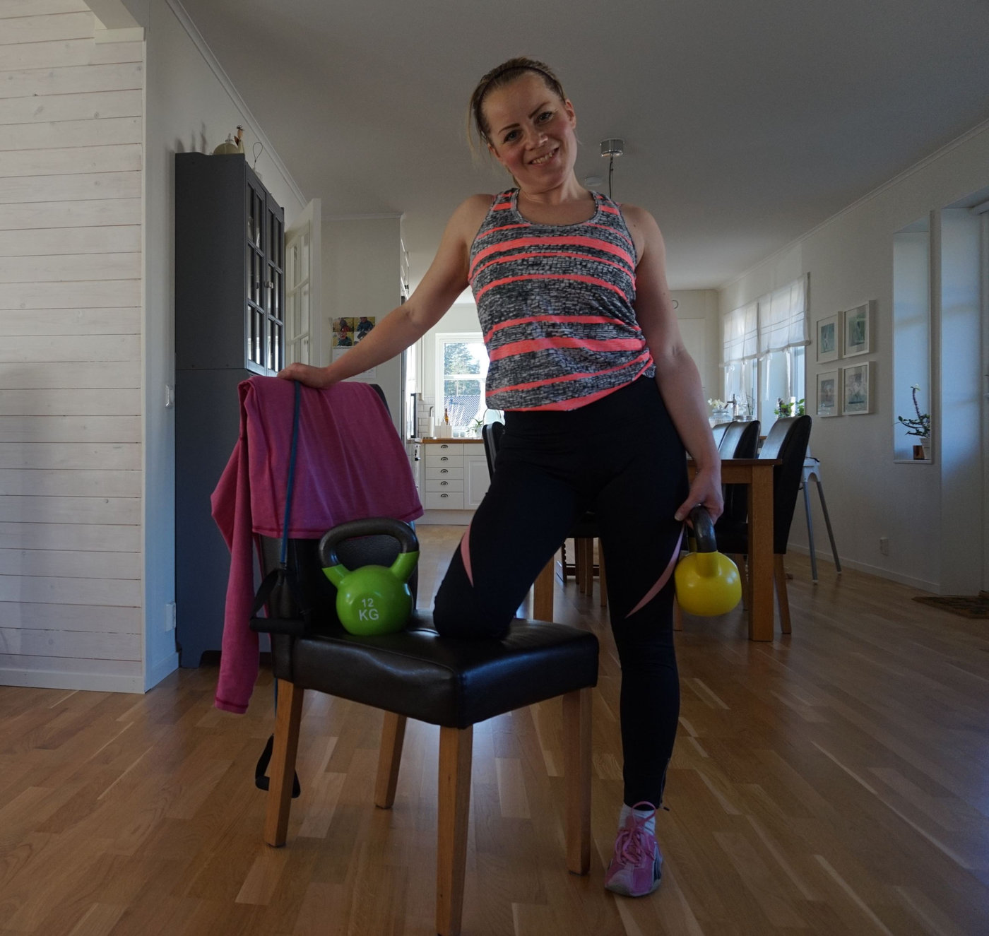 Nettan ville ha tips på övningar för hela kroppen med egen kroppsvikt och gärna med en stol till hjälp och Klara ville veta mina favoritövningar för hemmaträning, både med och utan redskap. Idag körde jag ett pass som jag vill tipsa om och som ger svar på dessa frågor. Det blev ett hemmaträningspass för hela kroppen, främst med egen kroppsvikt, men också med ett par kettlebells och med en stol till hjälp.