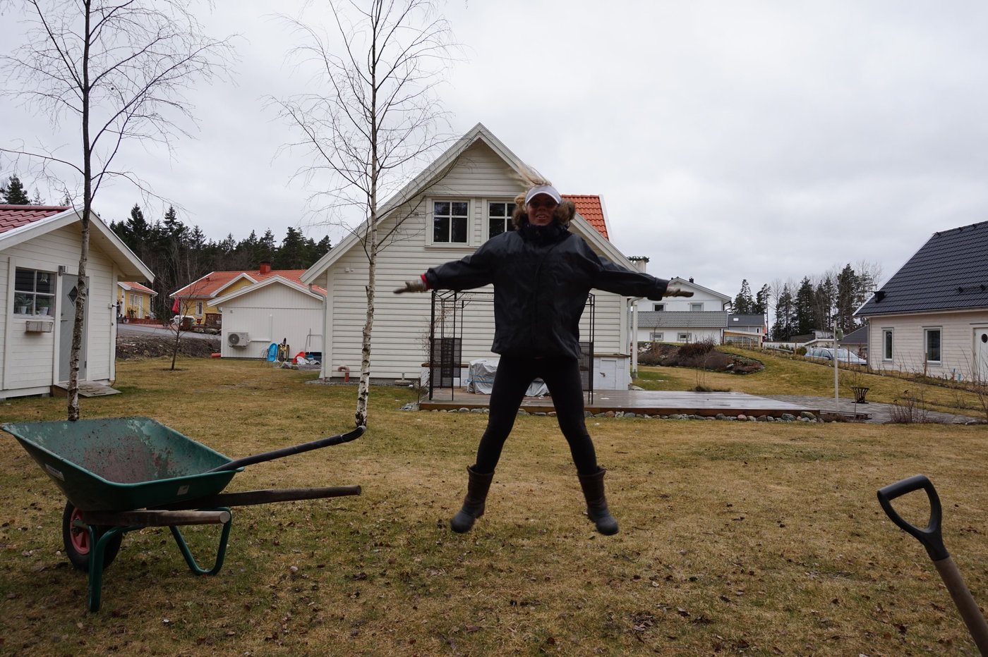 Här ser ni mig när jag hoppar i ett glädjeskutt tidigare idag i trädgården. Jag var glad efter att ha varit ute på tomten i nästan två timmar och hållit på med trädgårdsarbete. Nu när våren är här kommer också trädgårdssäsongen i gång och jag ser verkligen fram emot all tid vi kommer spendera med att hålla med på med våra trädgårdsprojekt.