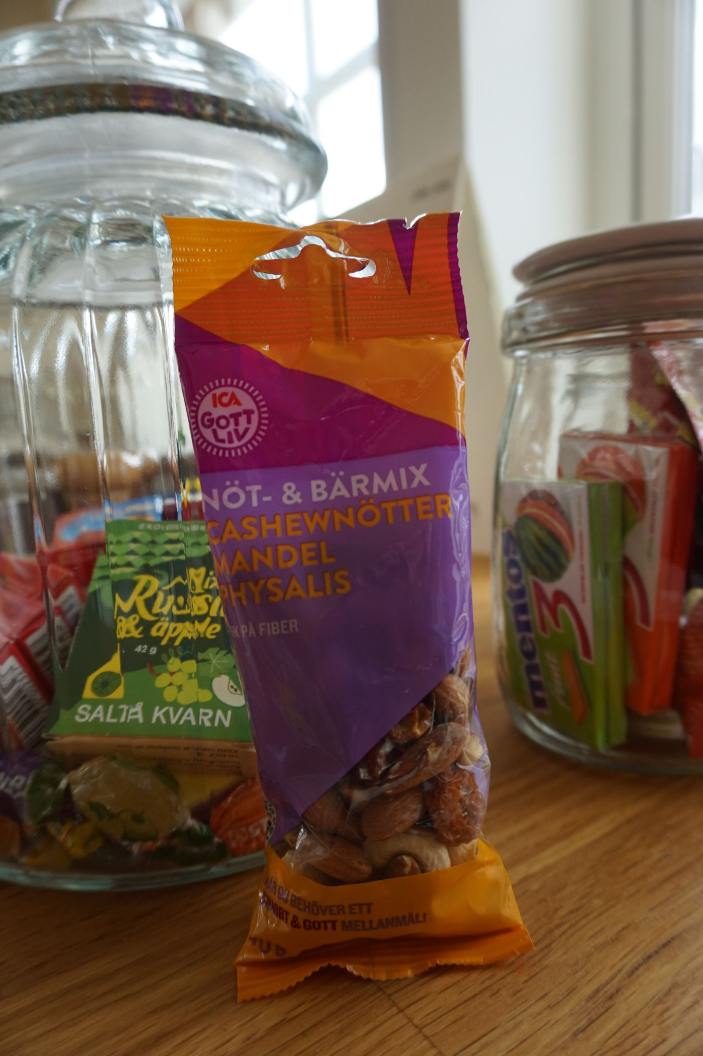 ICA Gott Liv har många bra produkter i sitt sortiment. Bland annat finns det den här typen av påsar med just nötter, mandlar och torkad frukt. perfekt att ha i skrivbordslådan på jobbet!