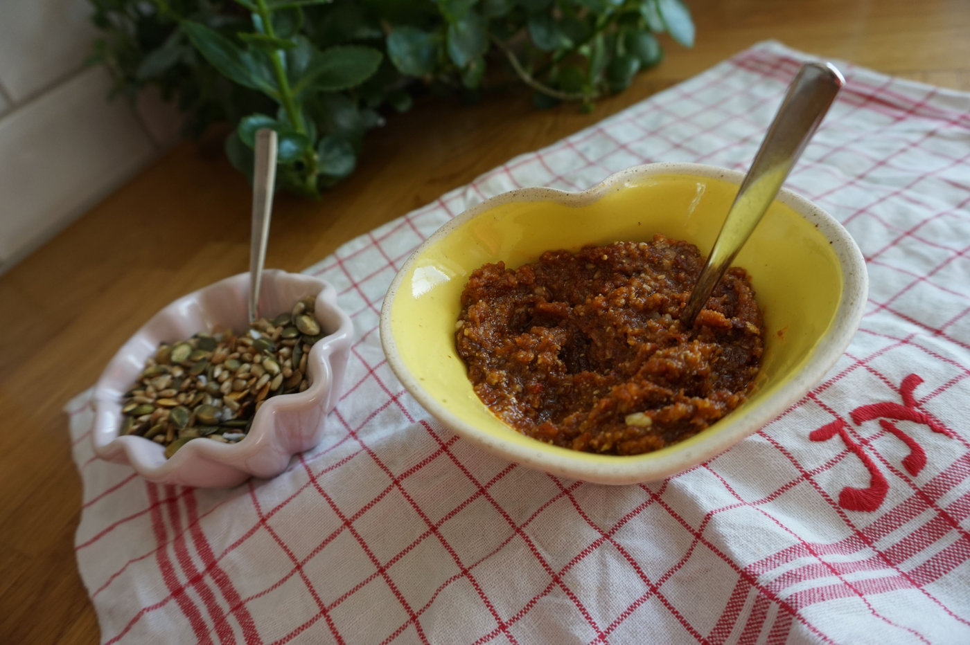 Röd pesto är en härlig variant till den traditionella basilikapeston eller ärtpeston. Jag har tidigare lagt upp receptet på röd pesto med soltorkade tomater här. Den här gången gjorde jag den lite lik, men inte riktigt på samma sätt. Så här kommer receptet på gårdagens röda pesto.